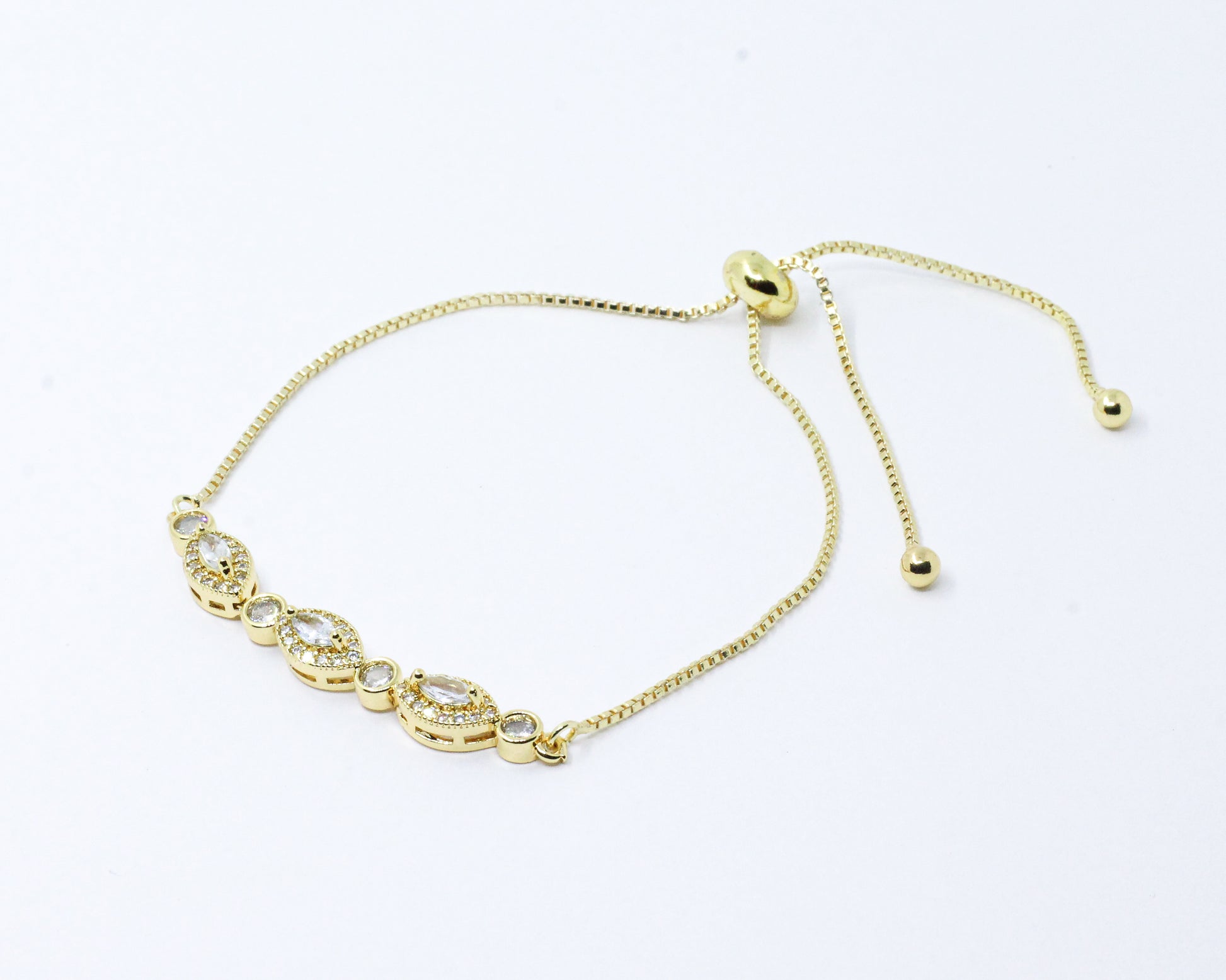 Una Pulsera dorada tipo corbatín, con tres elementos centrales en forma de ojo, cada uno adornado con un circón blanco que aporta un toque de luz y elegancia. En los costados, delicados biseles enmarcan un diseño versátil y lleno de sofisticación. Con esta joya, podrás expresar tu estilo y personalidad de manera sutil y cautivadora.