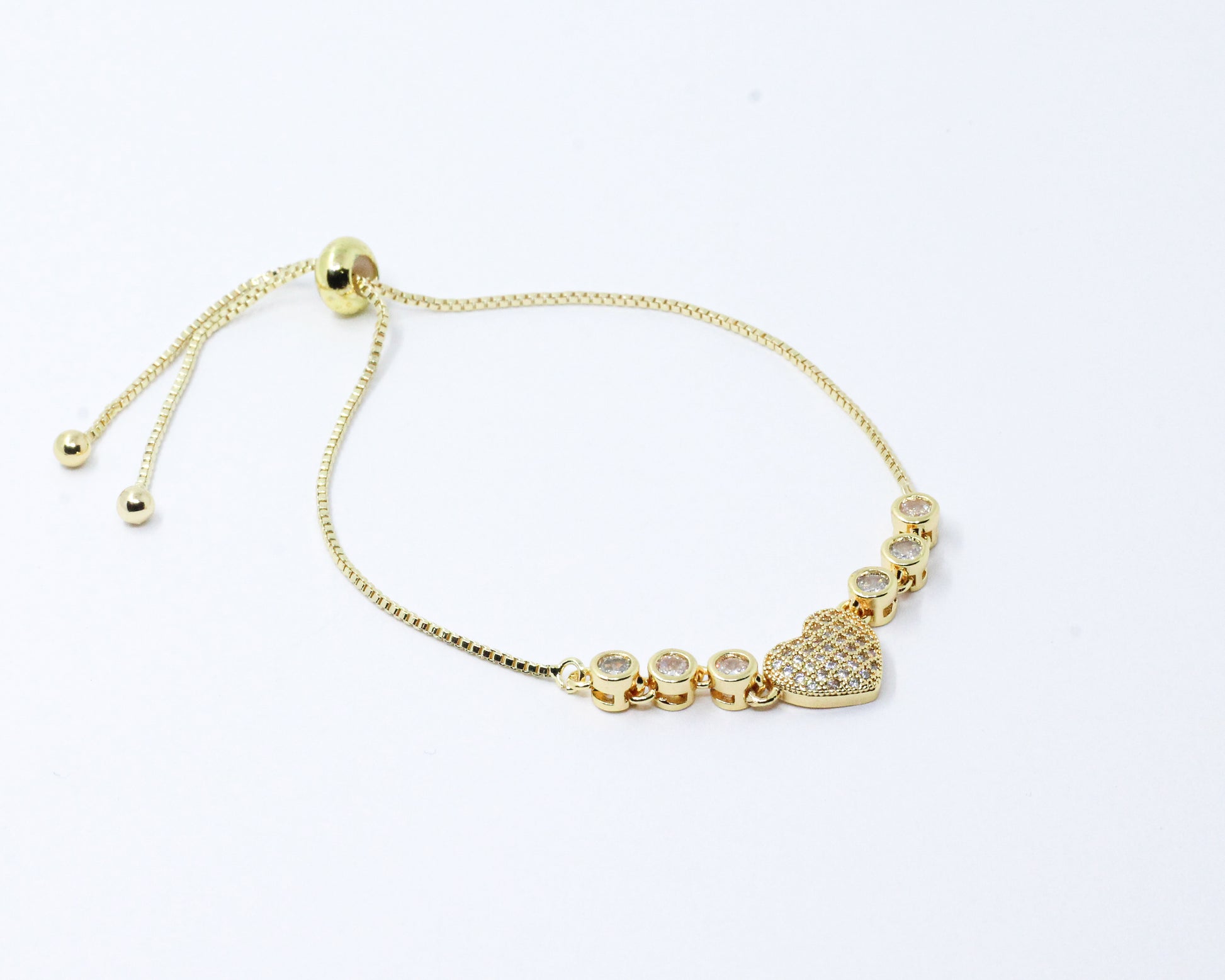 Una pulsera dorada tipo corbatín que presenta delicados biseles laterales adornados por circones blancos alineados con precisión, los cuales enmarcan un brillo sutil. En el centro, un fino corazón incrustado de microcircones añade un toque de delicadeza y encanto al diseño. Perfecta para cualquier ocasión, esta pulsera es una declaración de estilo y sentimiento.