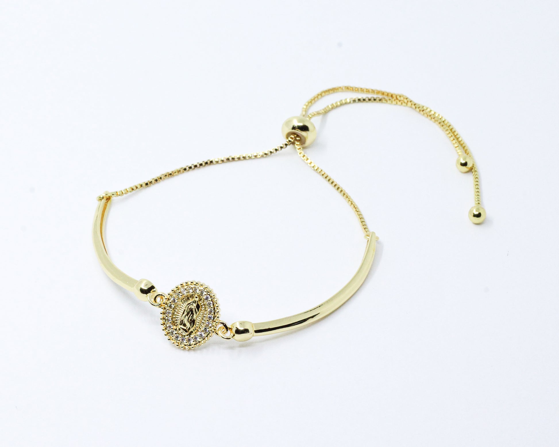 Una pulsera dorada tipo corbatín, con imagen de la Virgen de Guadalupe en su parte central con microcircones en su silueta que destellan con sutileza. Sus laterales rígidos aportan un toque estilizado y refinado al diseño. Luce esta pieza icónica con orgullo y demuestra tu devoción con estilo.