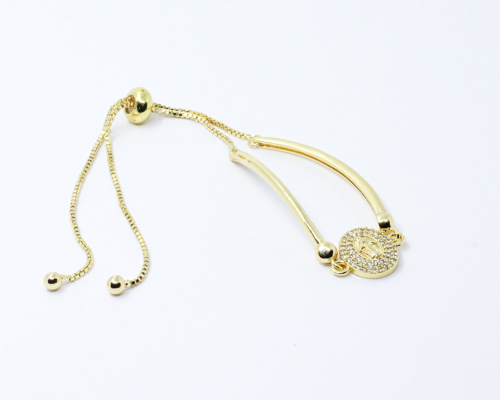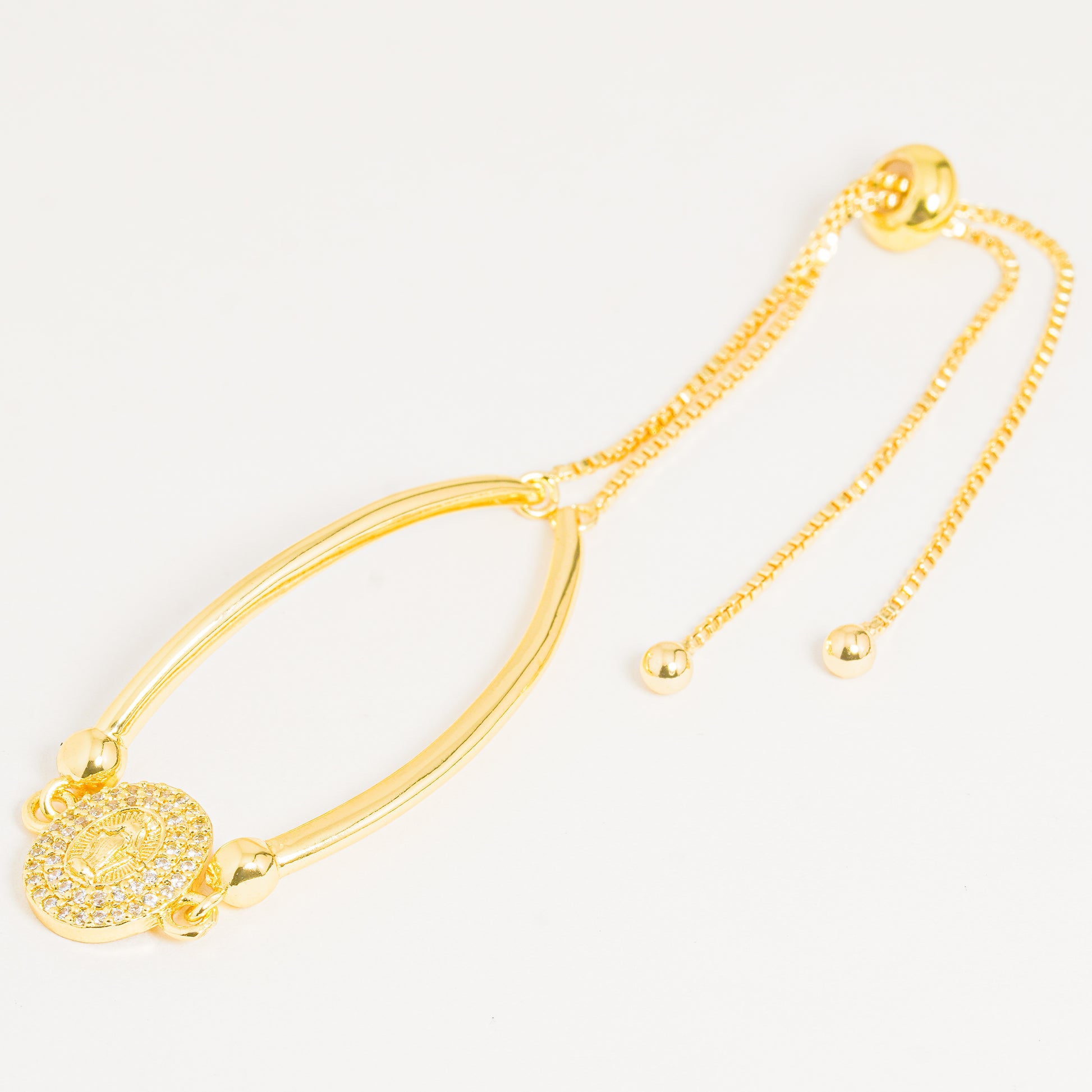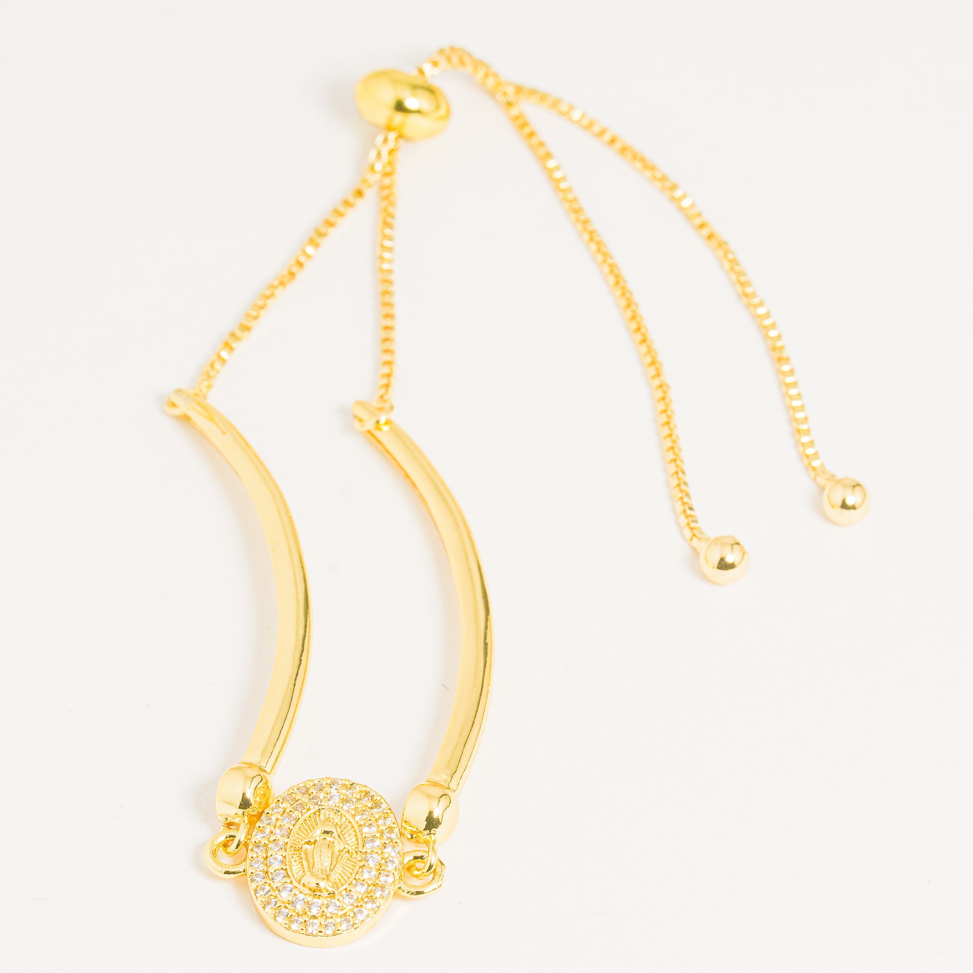 Una Pulsera dorada tipo corbatín, con una delicada medalla de la Virgen Milagrosa en el centro, enmarcada por un doble carril de microcircones que irradian un brillo sutil. Sus laterales rígidos complementan el diseño con un toque de delicadeza y equilibrio. Añade un toque de fe y elegancia a tu estilo con esta hermosa pulsera.