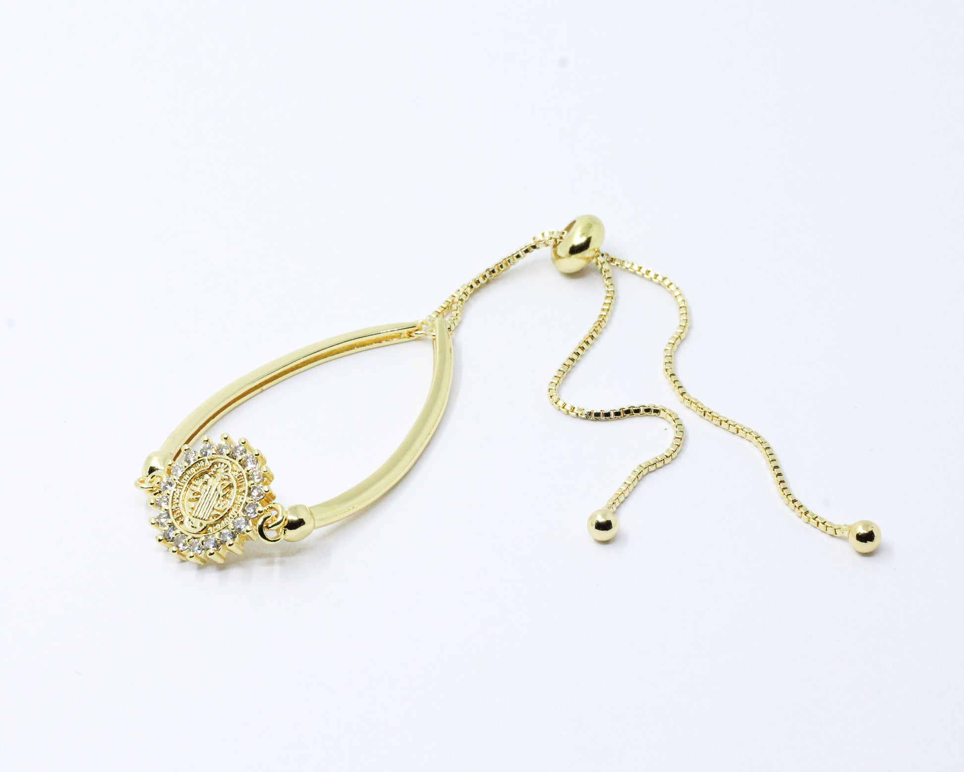 Una pulsera dorada tipo corbatín, con la imagen de San Benito en su parte central y microcircones en su silueta que destellan con sutileza. Sus laterales rígidos aportan un toque estilizado y refinado al diseño. ¡Luce radiante con esta elegante pulsera!