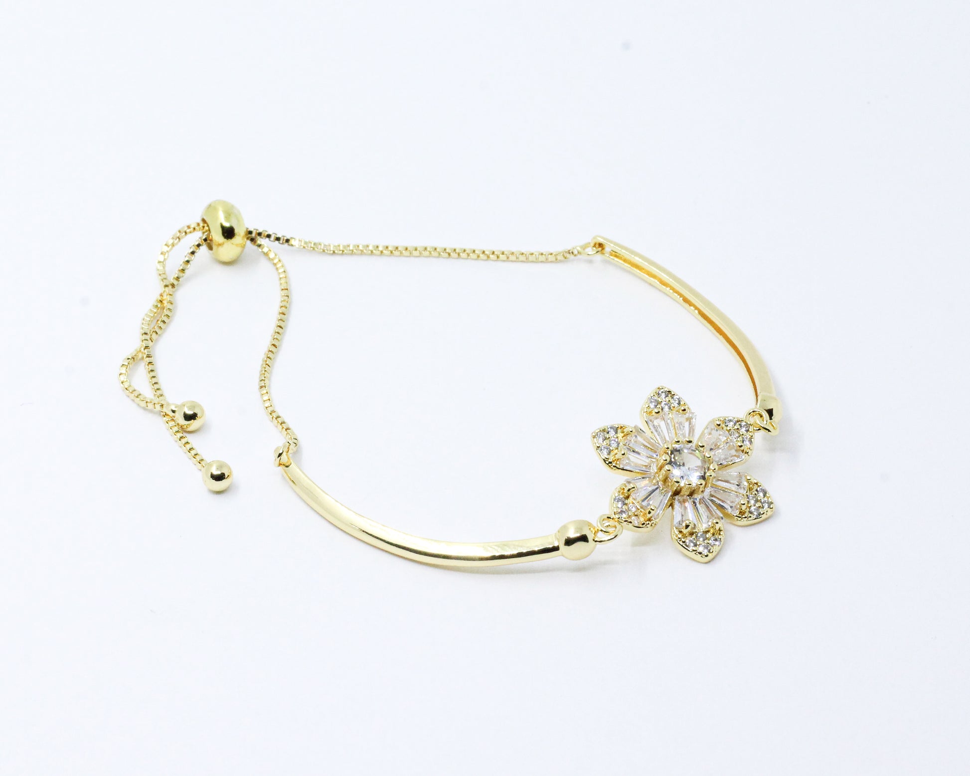 Una pulsera dorada tipo corbatín, con una flor central estilo baguette engastada con microcircones que aportan un brillo elegante. Sus laterales rígidos presentan un acabado pulido y distintivo que realza la sofisticación del diseño. Agrega un toque de elegancia a tus atuendos con esta hermosa pulsera.