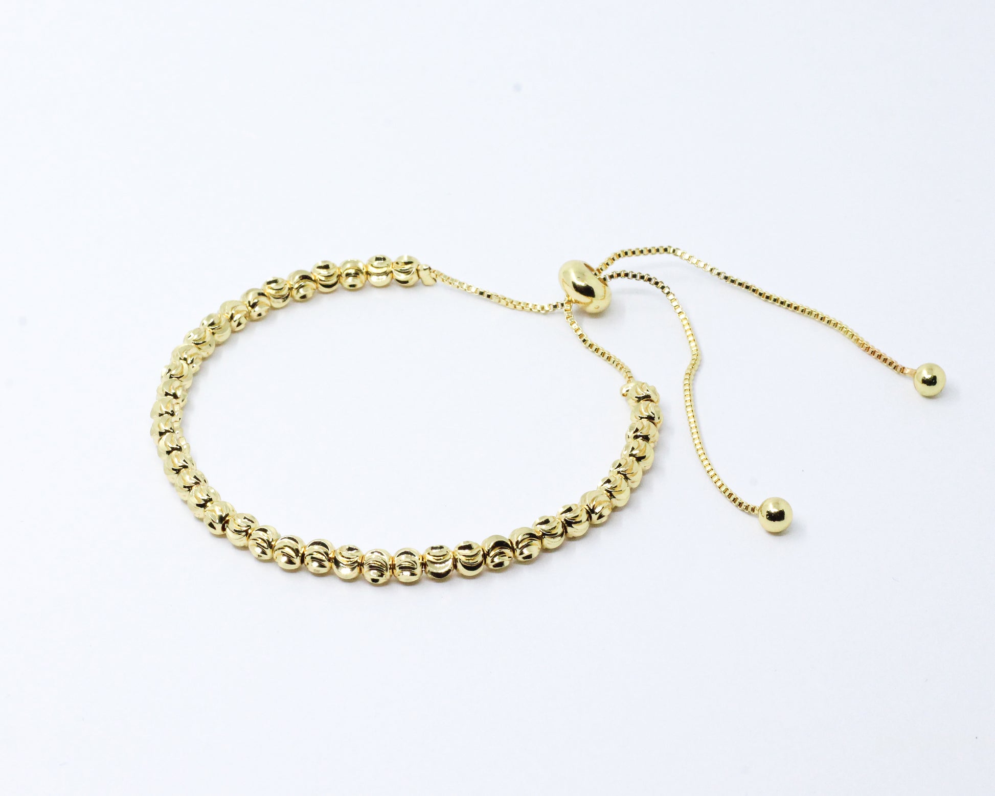 Una pulsera tipo corbatín compuesta por balines #4, con un fino acabado diamantado que aporta un brillo sutil y elegante, realzando la sofisticación del diseño. ¡Haz una declaración de moda con la Pulsera Dorada Balines Diamantados!