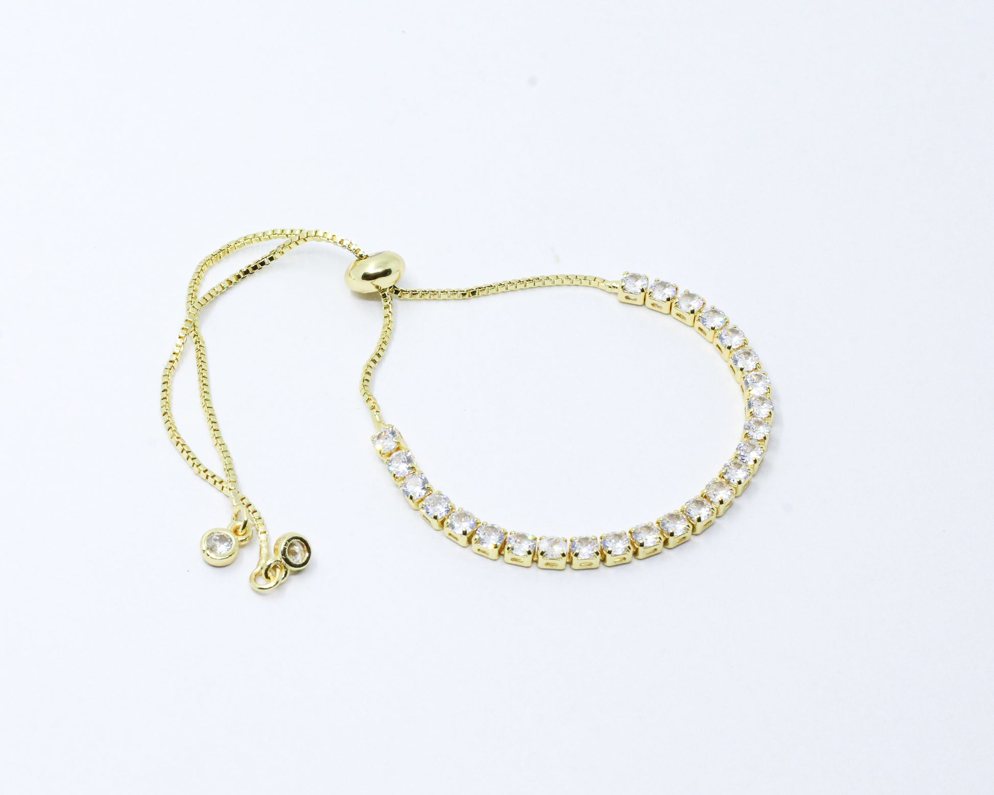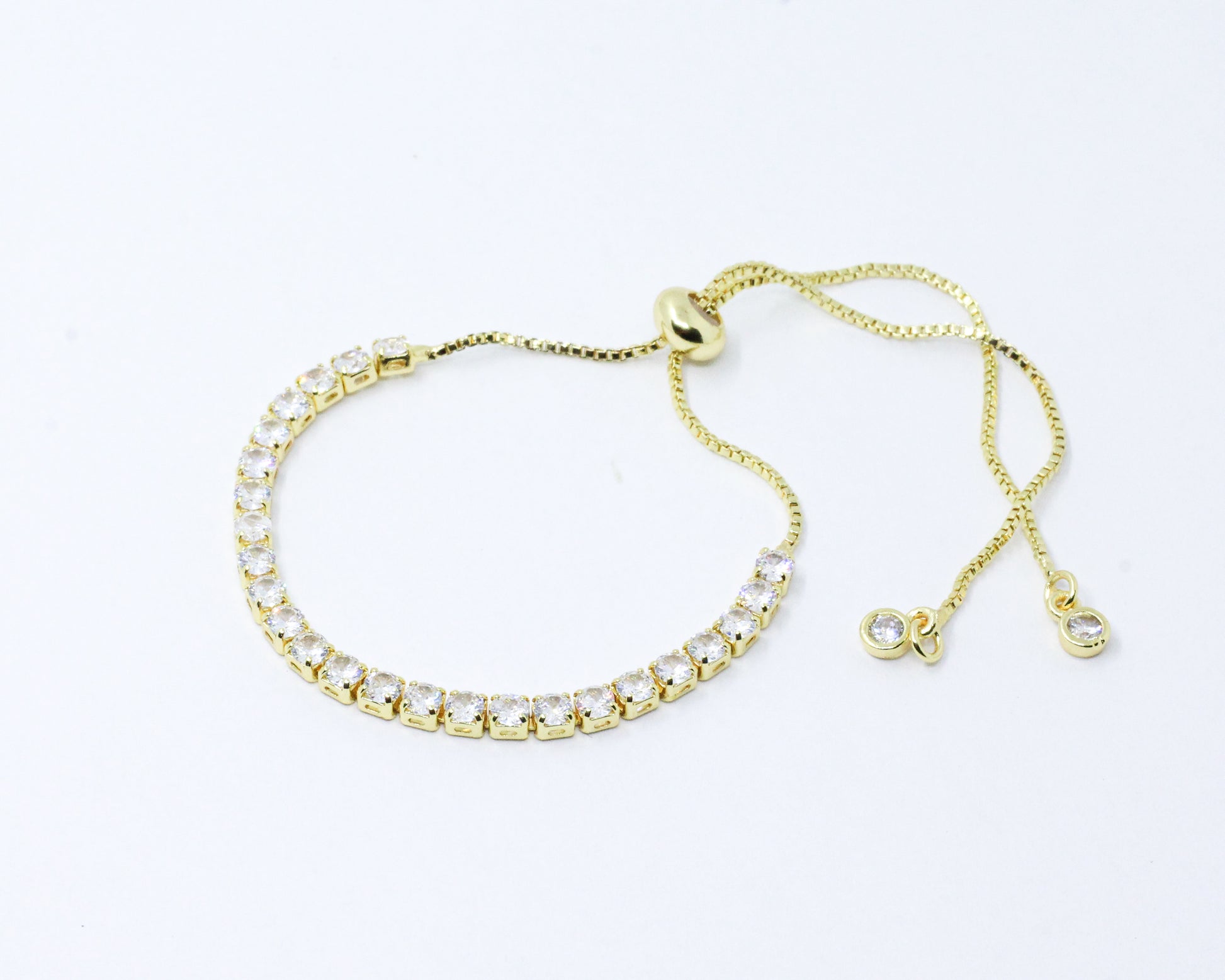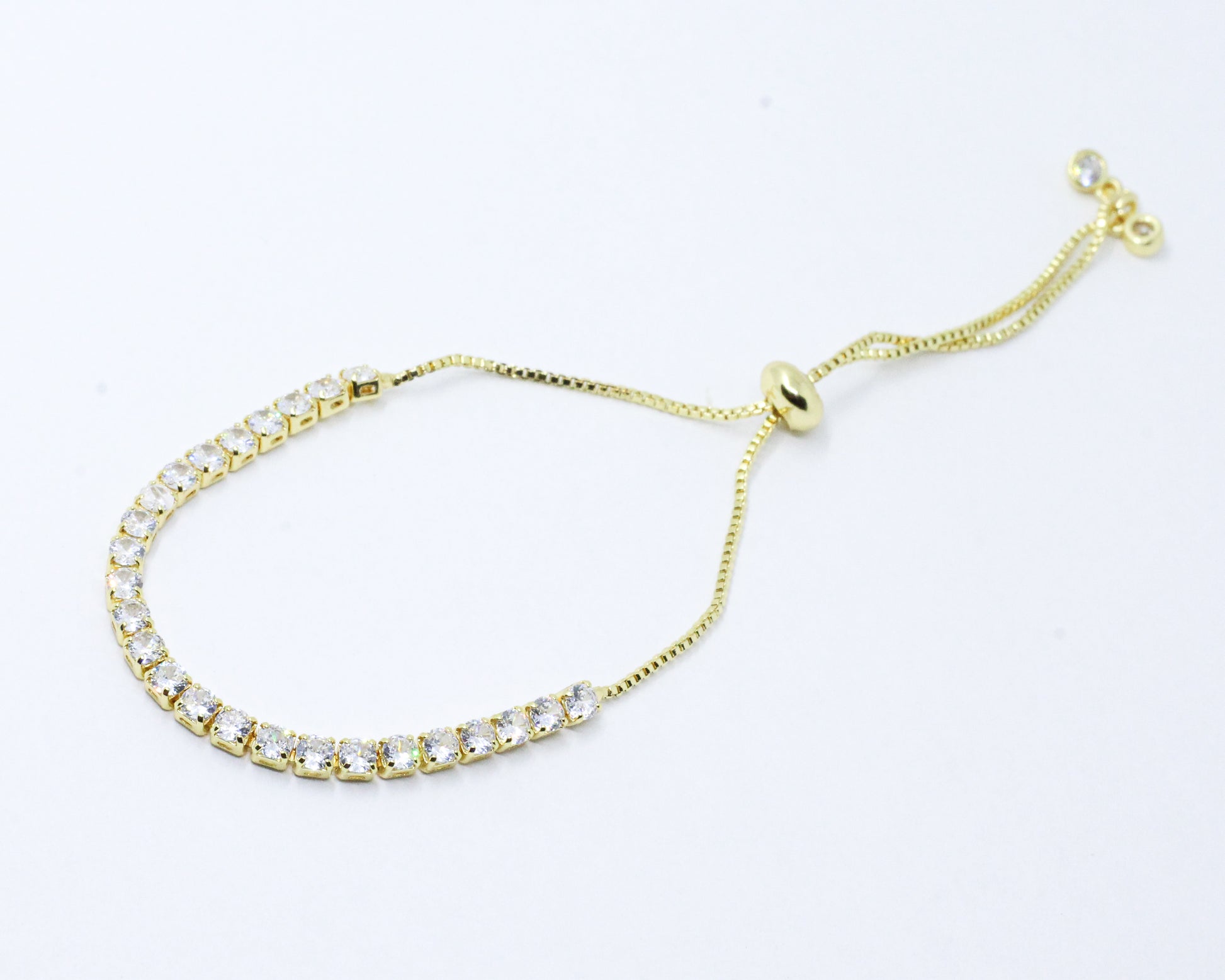 Una pulsera dorada tipo corbatín compuesta por una hilera de circones blancos de corte brillante, dispuestos en una estructura estilo tenis que ofrece comodidad y versatilidad para el día a día. ¡Hazte notar con esta impresionante joya que te hará lucir sofisticada y a la moda!