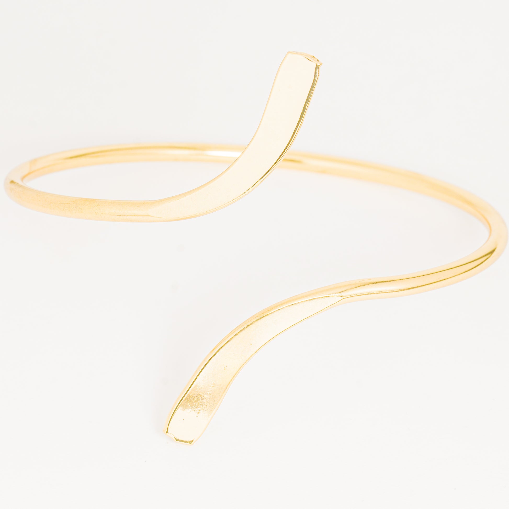 Una pulsera dorada de diseño curvado y abierto, con líneas suaves que envuelven la muñeca de manera elegante y moderna. Su forma fluida crea un efecto dinámico y sofisticado, ideal para quienes buscan un accesorio minimalista pero con carácter.