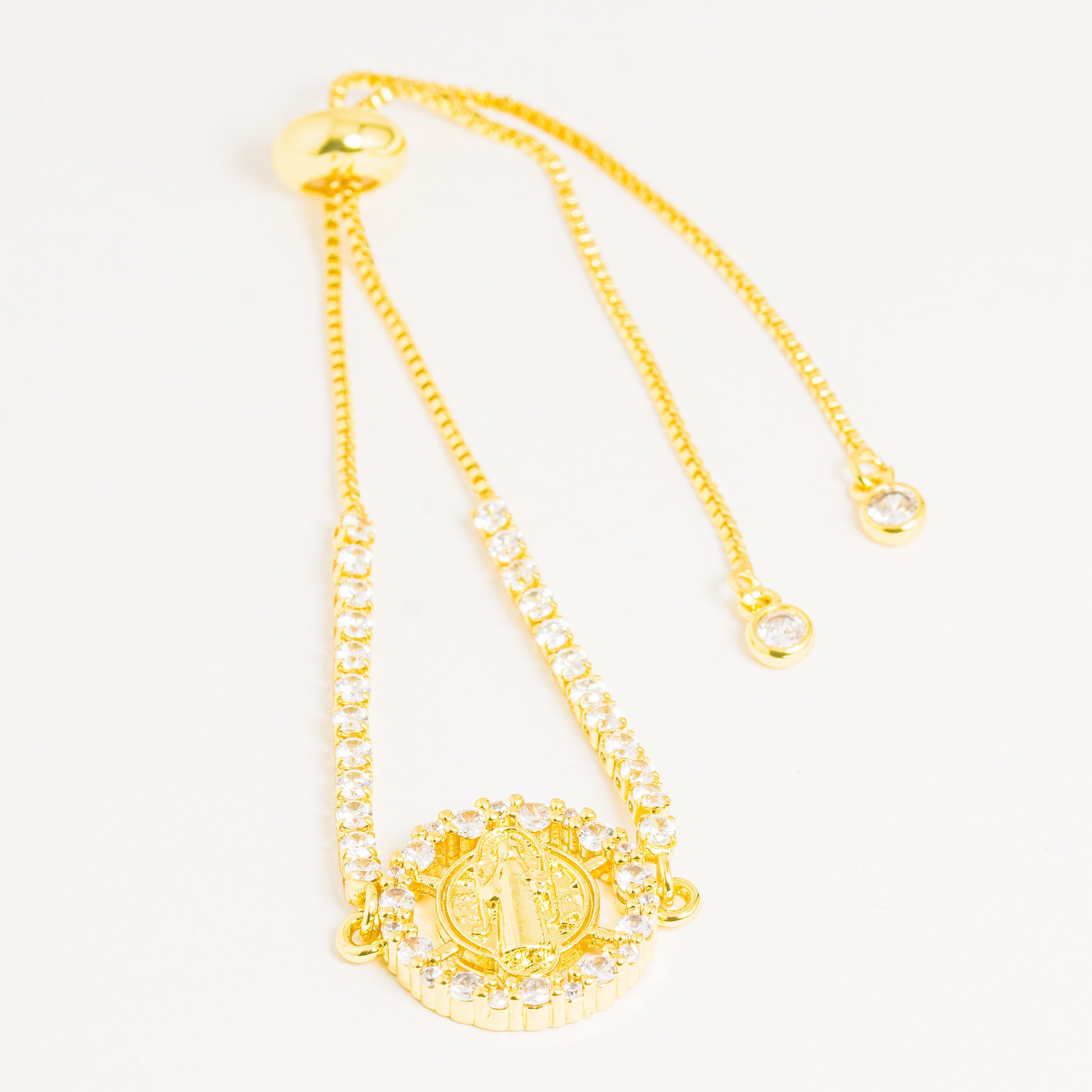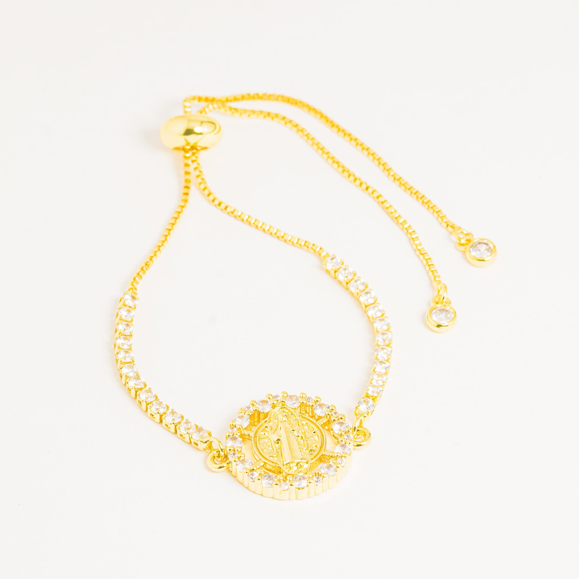 Una pulsera dorada ajustable de diseño elegante y simbólico, elaborada con una delicada cadena decorada con una fila de cristales que aportan un brillo refinado. En el centro destaca un medallón circular con una figura religiosa en relieve, rodeada de cristales que realzan su presencia y le dan un acabado luminoso y sofisticado.