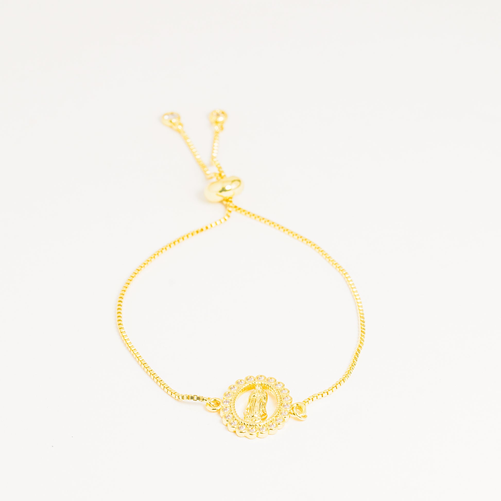 Una pulsera dorada de estilo delicado y significado especial, diseñada con una cadena fina y ajuste deslizable que se adapta cómodamente a la muñeca. En el centro destaca un medallón ovalado con una figura religiosa en relieve, rodeada de pequeños cristales que aportan un brillo sutil y elegante.