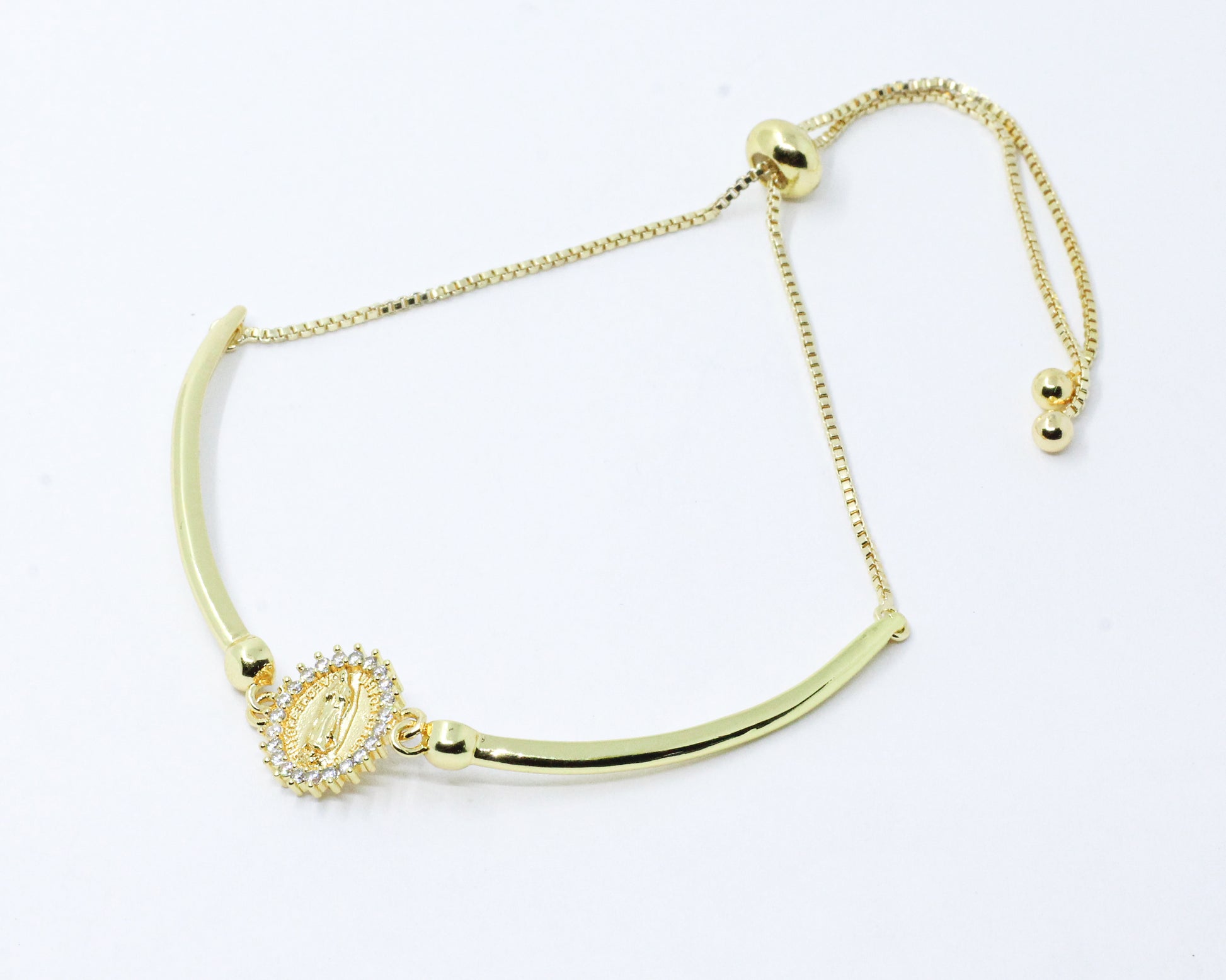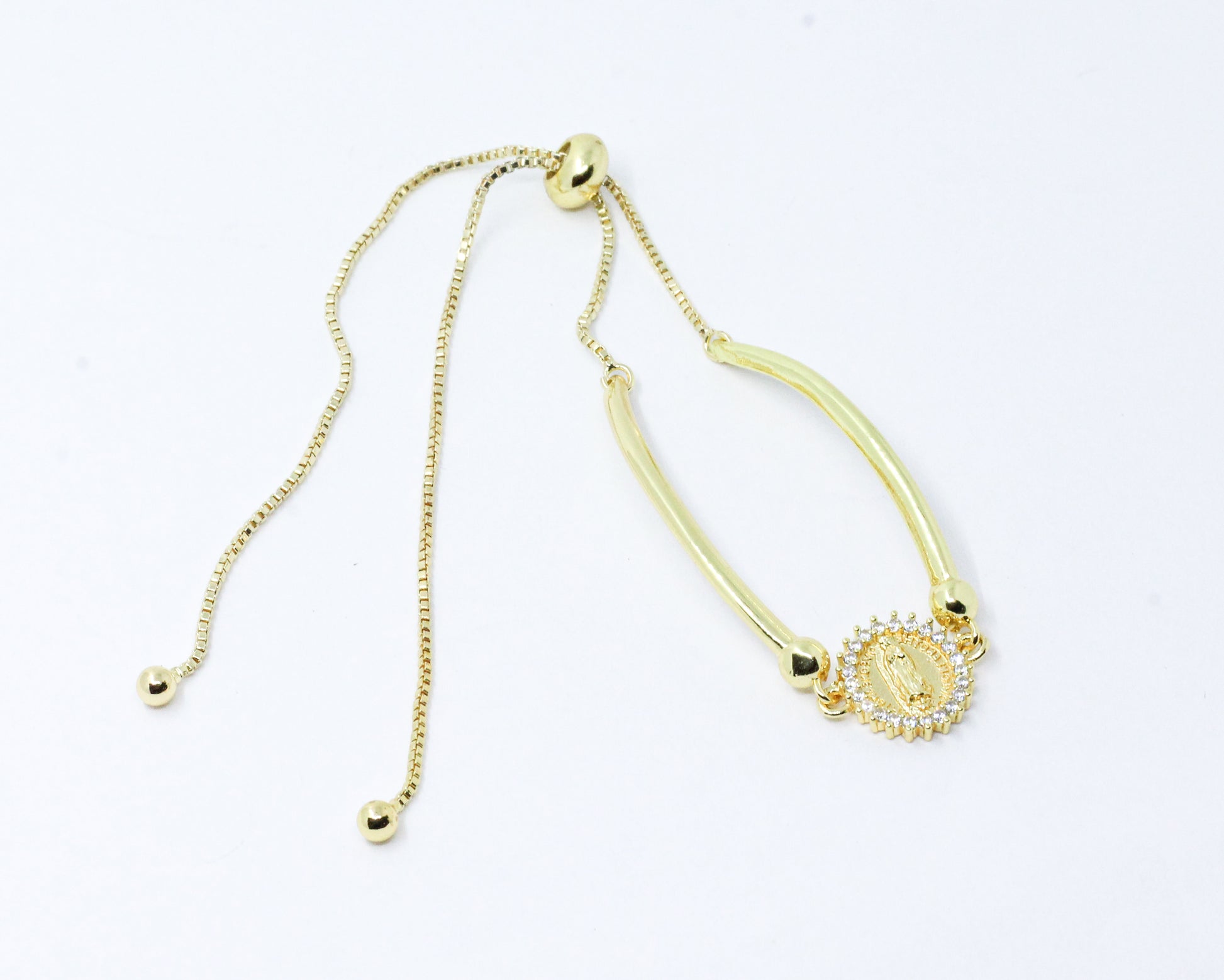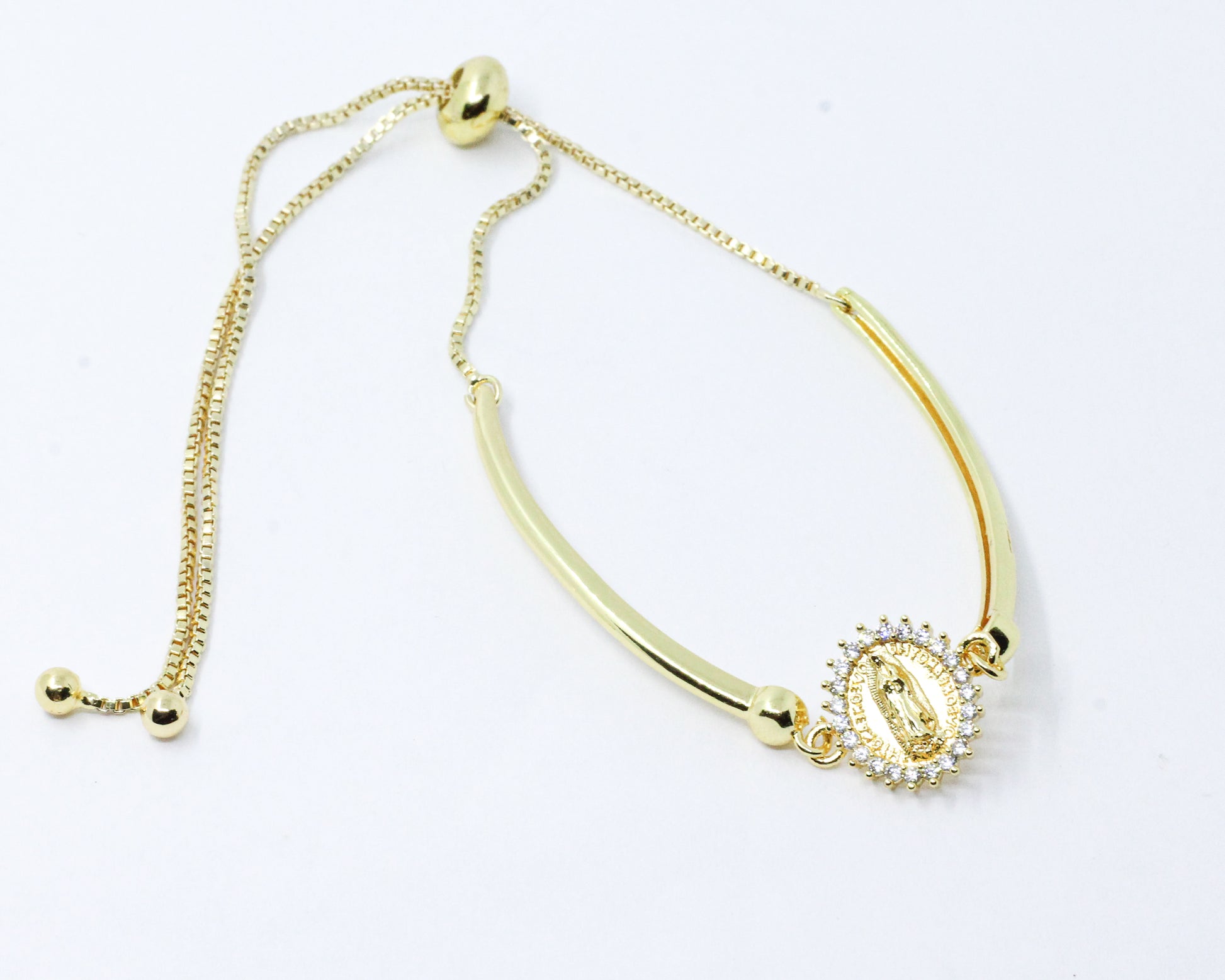 Una pulsera dorada tipo corbatín, con imagen de la Virgen de Guadalupe en su parte central con microcircones en su silueta que destellan con sutileza. Sus laterales rígidos aportan un toque estilizado y refinado al diseño. ¡Lleva contigo la bendición de la Virgen a donde vayas con esta pulsera única!