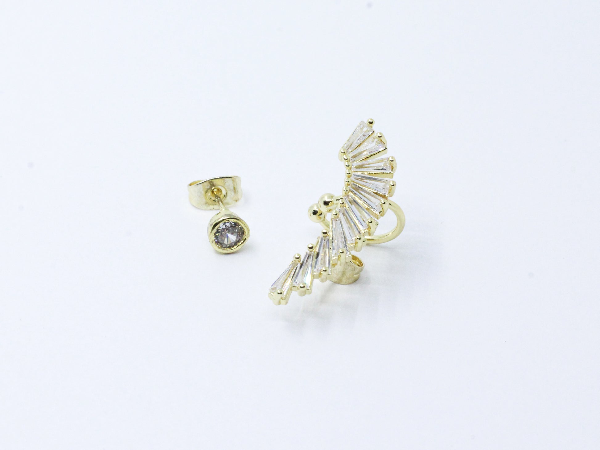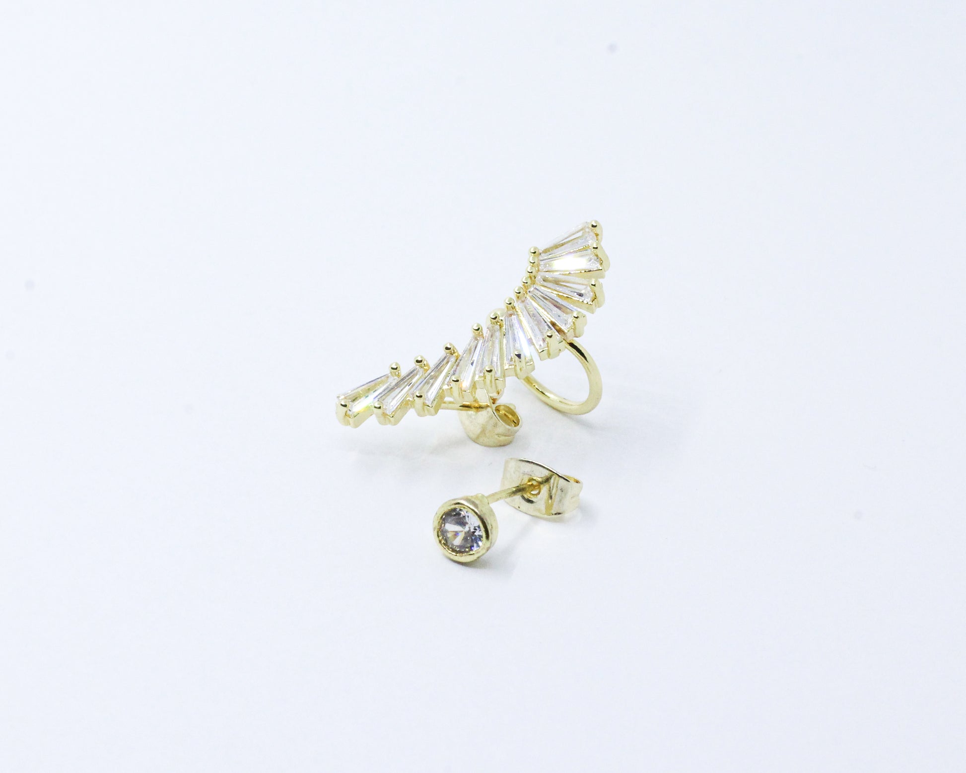 Un Set compuesto por un topo tipo bisel con un circón blanco clásico, acompañado de un earcuff estilo baguette con circones alargados que se despliegan en forma de abanico, creando un contraste equilibrado entre lo sutil y lo llamativo. ¡Destaca con estilo y glamour!