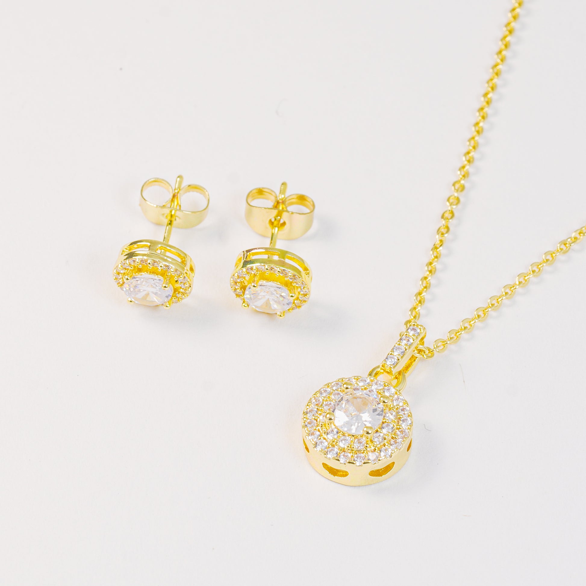 Un set sofisticado y luminoso compuesto por collar y topos circulares adornados con cristales que enmarcan una piedra central de cristal brillante. Su diseño equilibrado y moderno crea un efecto de luz irresistible, perfecto para quienes aman los accesorios que destacan sin exagerar.