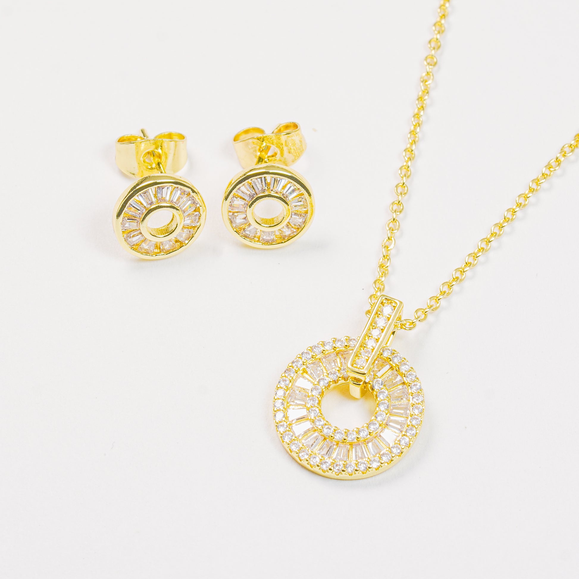 Un set moderno y sofisticado compuesto por collar y topos dorados con un diseño circular que enmarca un interior de cristal brillante. Su acabado pulido y su luz delicada lo convierten en el accesorio ideal para agregar elegancia sin esfuerzo a cualquier look.
