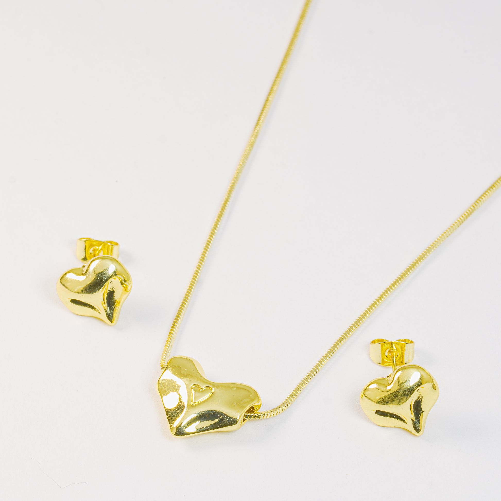 Un aderezo compuesto por topos y collar de tejido serpiente graduable en largor, adornado con un dije en forma de corazón estilo chunky con contrastes en su figura. Un diseño moderno y audaz que aporta personalidad a cualquier look.