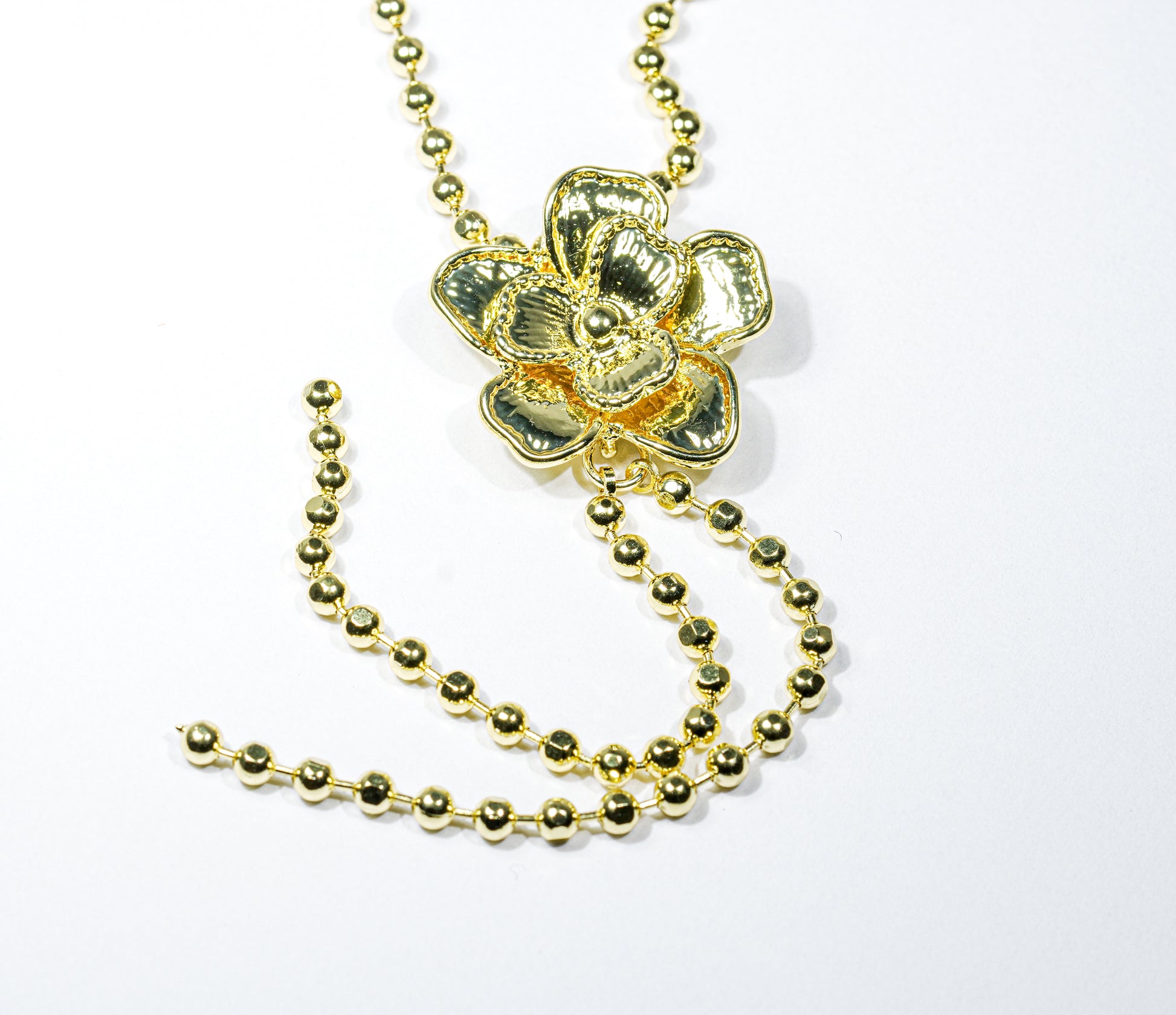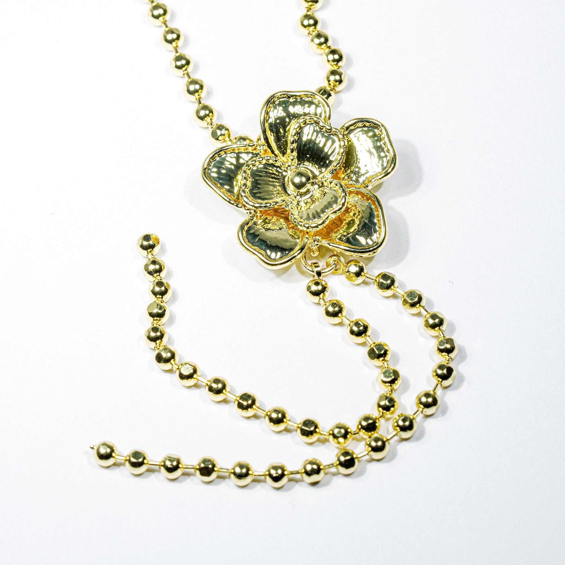 Un aderezo compuesto por topos y un collar con tejido de balines graduable en largor, realzado en el centro por una flor que añade un delicado toque de elegancia y feminidad.