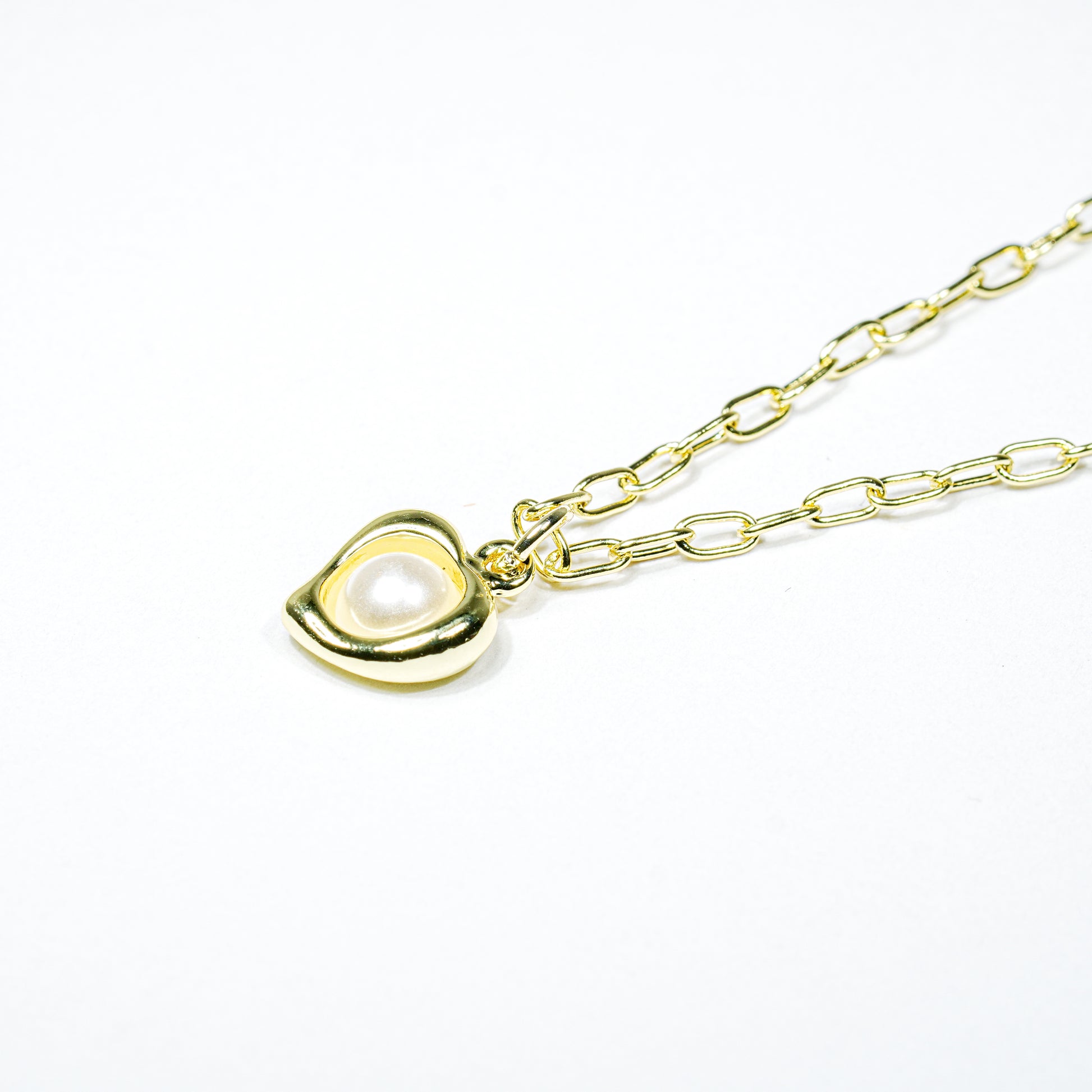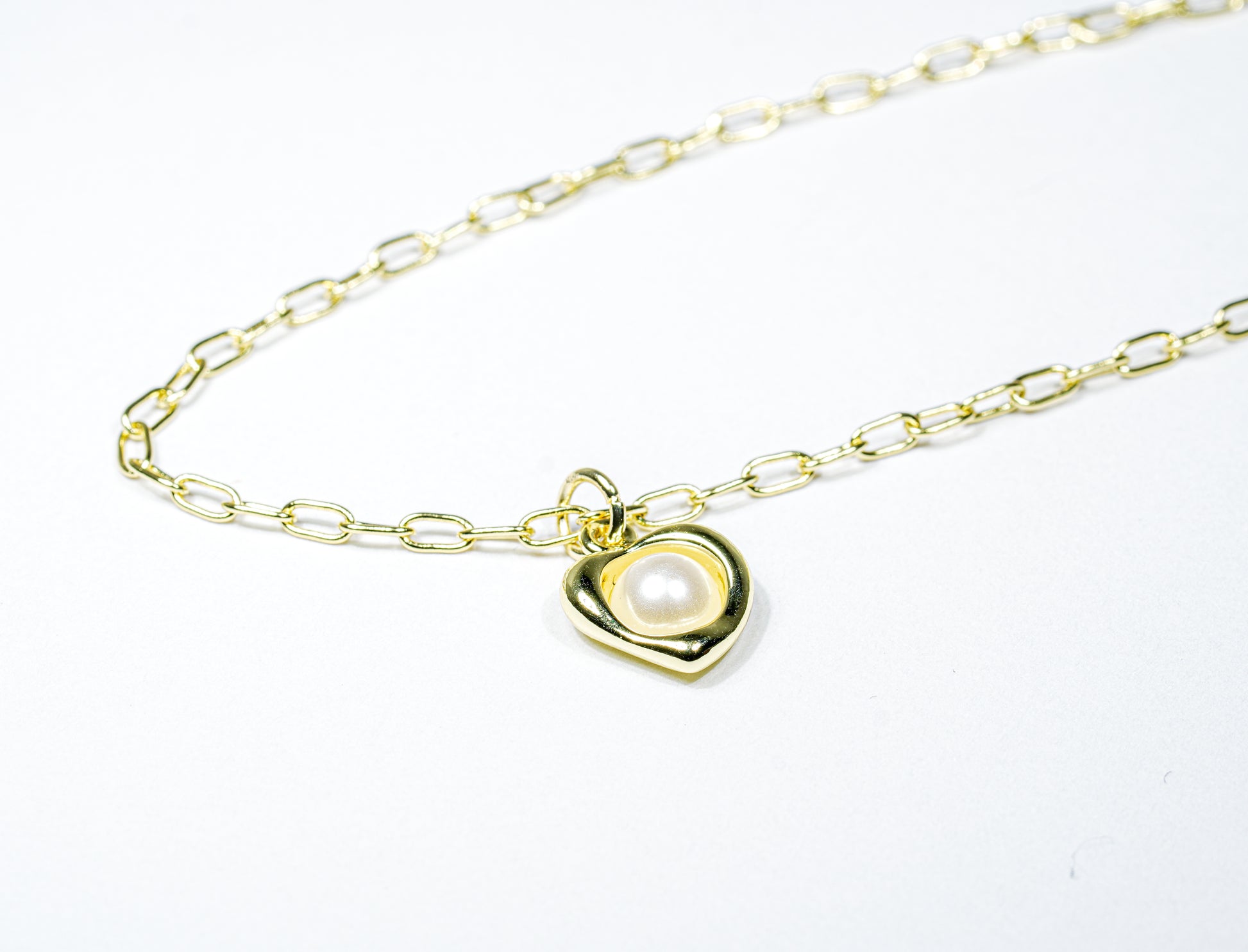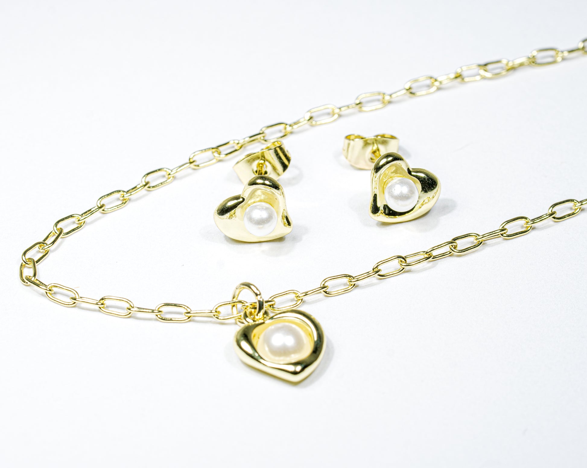 Un aderezo compuesto por topos y un collar de eslabones con largo graduable, adornado con un dije en forma de corazón de bordes redondeados y una delicada perla en el centro. Una pieza que combina elegancia clásica con un toque de dulzura.