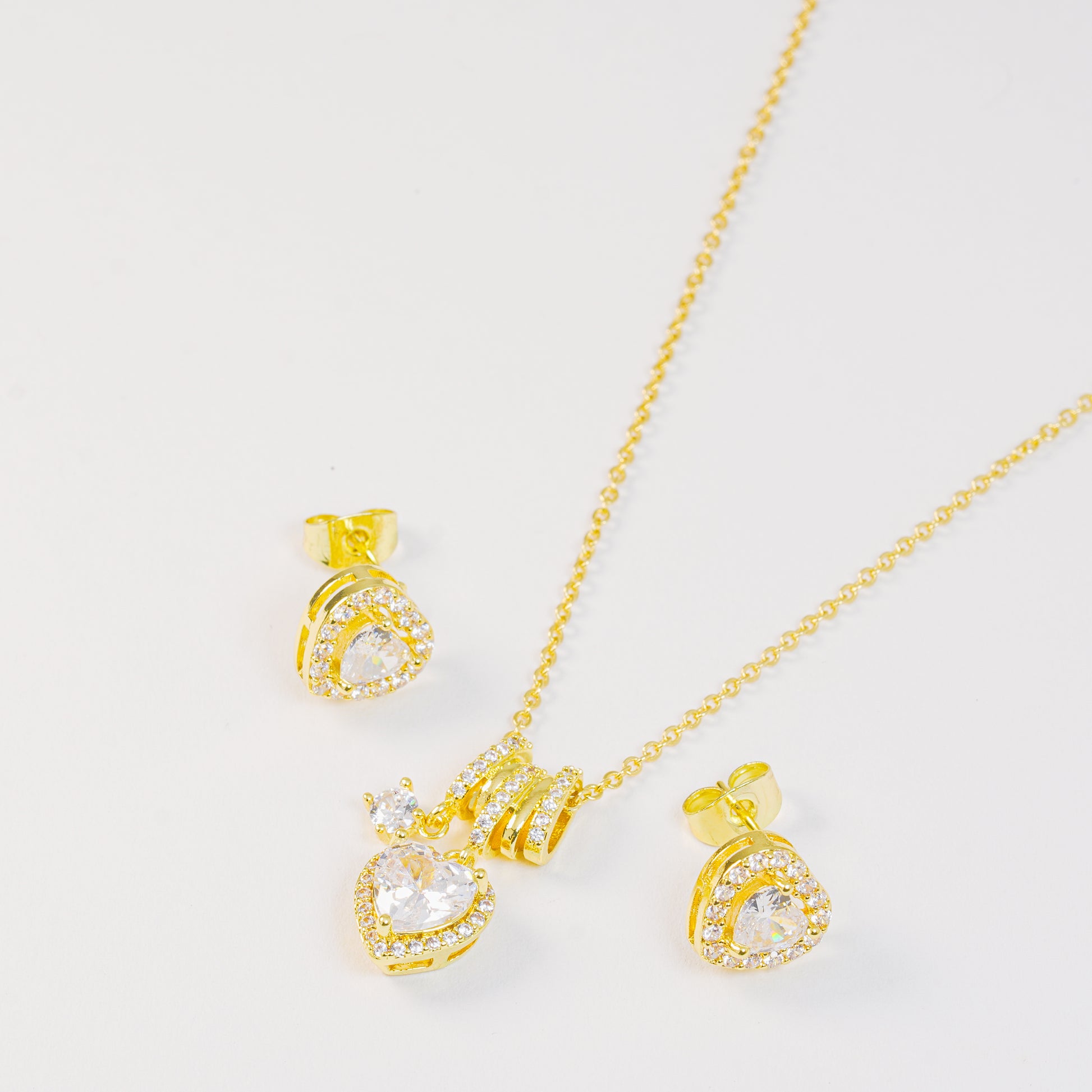 Un set romántico y brillante compuesto por collar y topos en forma de corazón dorado, cada pieza decorada con pequeñas piedritas de cristal que bordean la figura y realzan su forma. Al centro destaca un cristal más grande en forma de corazón, creando un efecto luminoso y encantador que atrae miradas al instante.