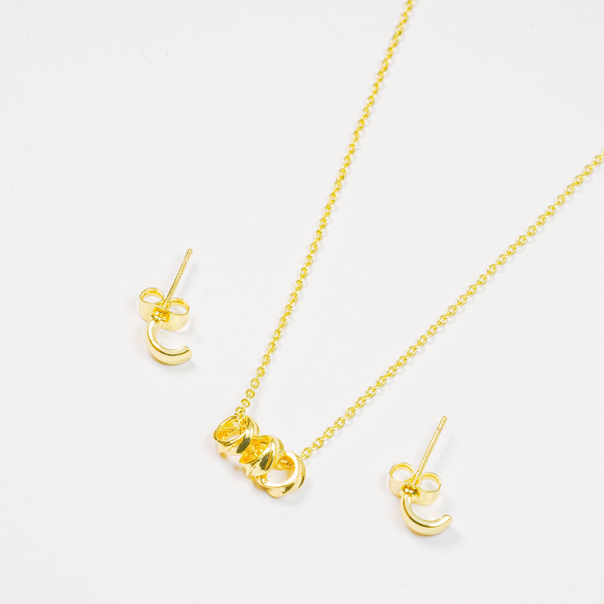 Un diseño moderno y encantador que combina un collar en forma de espiral, símbolo de energía y movimiento, con topos delicados en forma de luna que aportan un toque místico y femenino. Un set perfecto para quienes buscan accesorios únicos, ligeros y llenos de estilo.