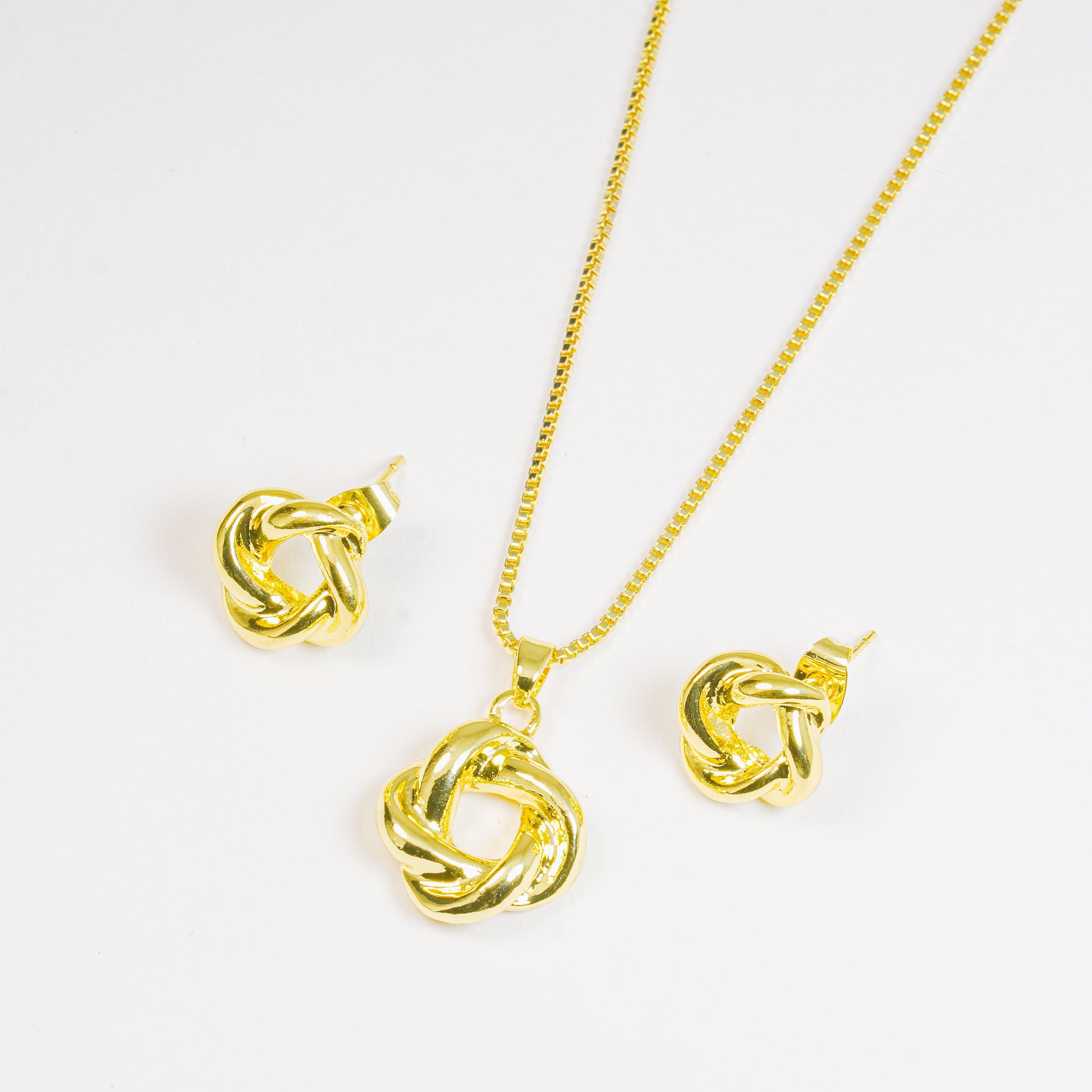 Un diseño moderno y sofisticado donde las formas doradas se entrelazan creando un efecto elegante y distintivo. Un set perfecto para complementar cualquier look con un toque contemporáneo y lleno de estilo.