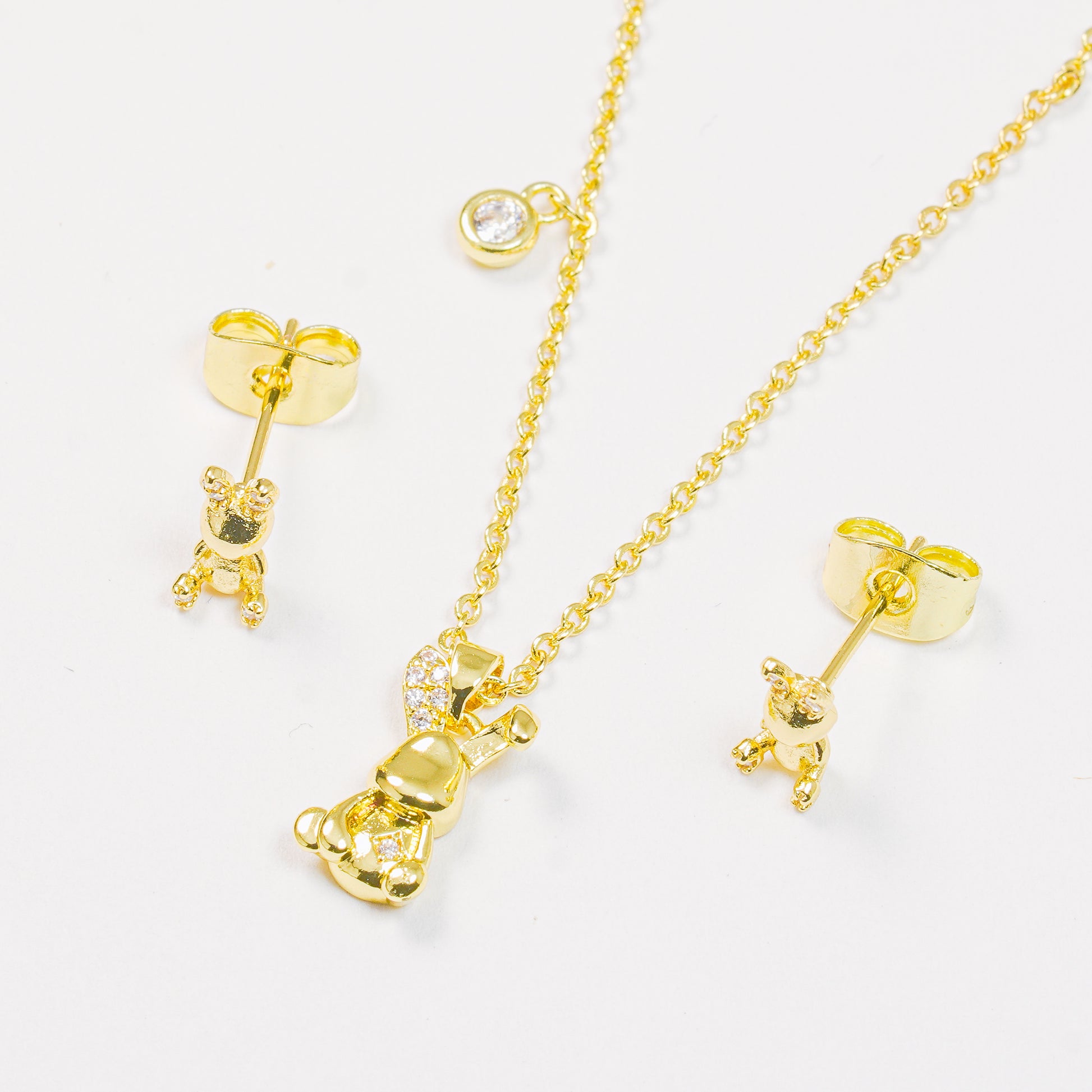 Un set delicado y encantador compuesto por topos y collar con figuras de conejos dorados, diseñados en líneas finas que resaltan su ternura y estilo minimalista. Su acabado brillante aporta un toque sutil y elegante que se adapta a cualquier look.