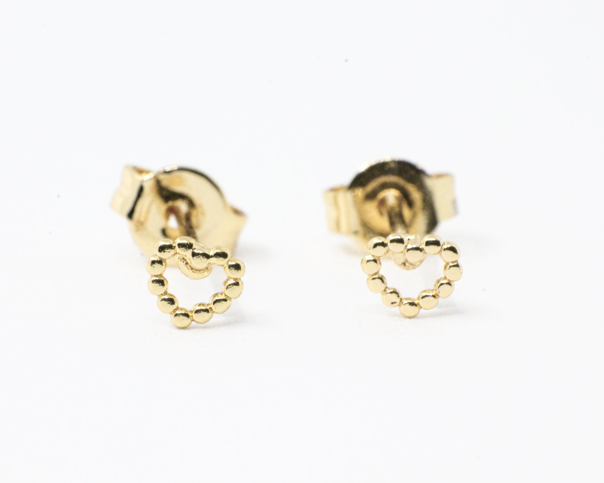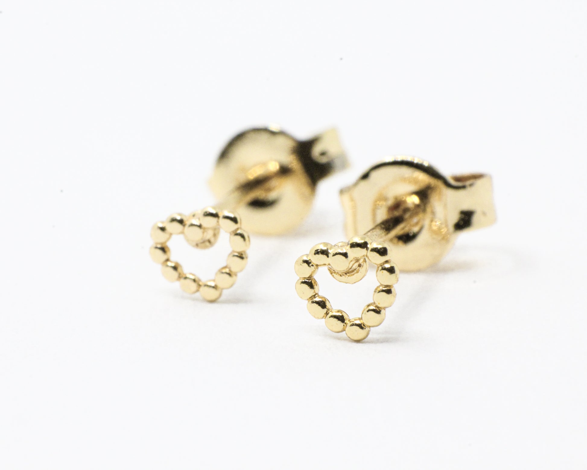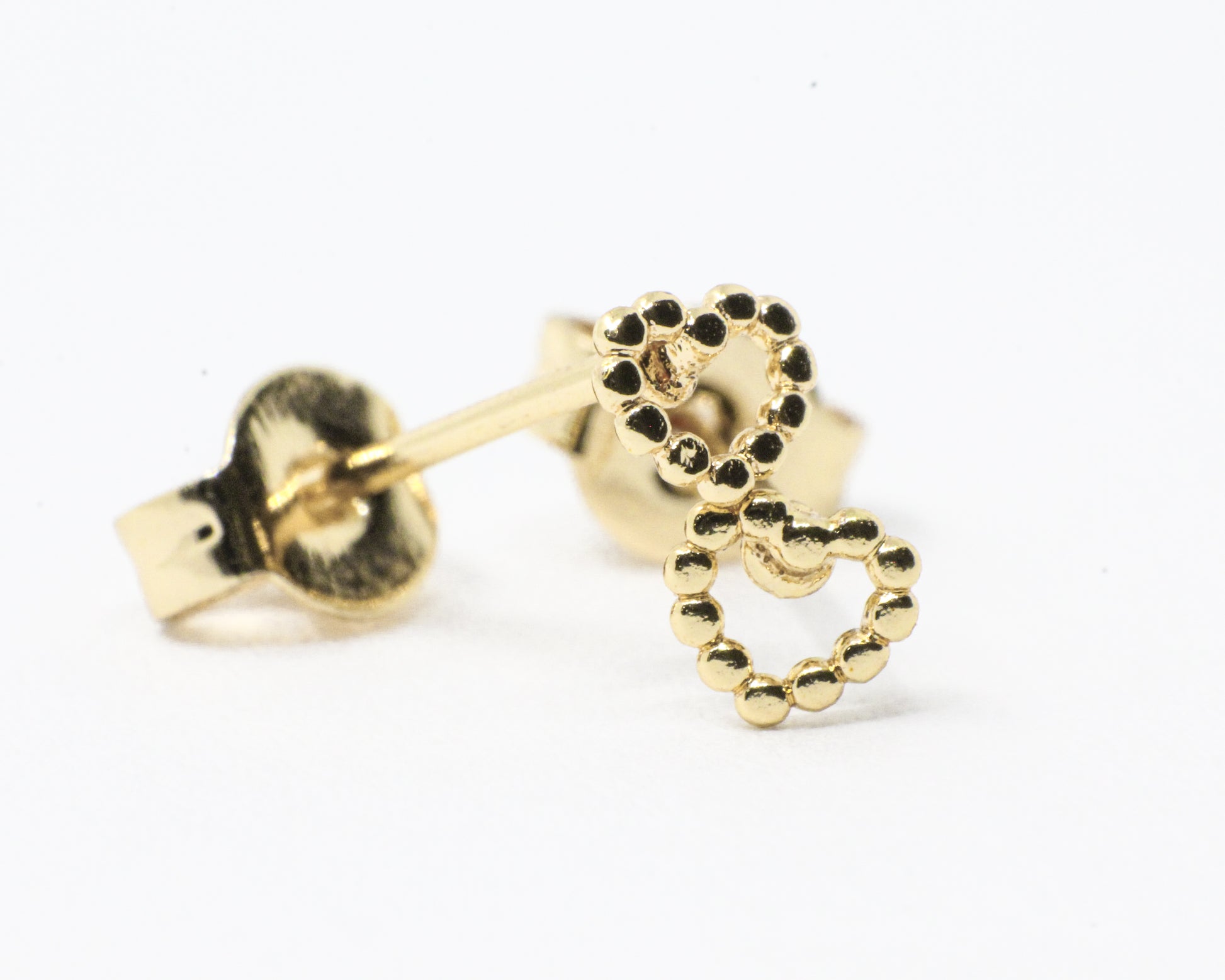 Un par de topos en forma de corazón con silueta en esferas que transmiten armonía y suavidad. Con su hermoso diseño y incrustaciones de bolitas doradas, este accesorio es perfecto para cualquier ocasión.