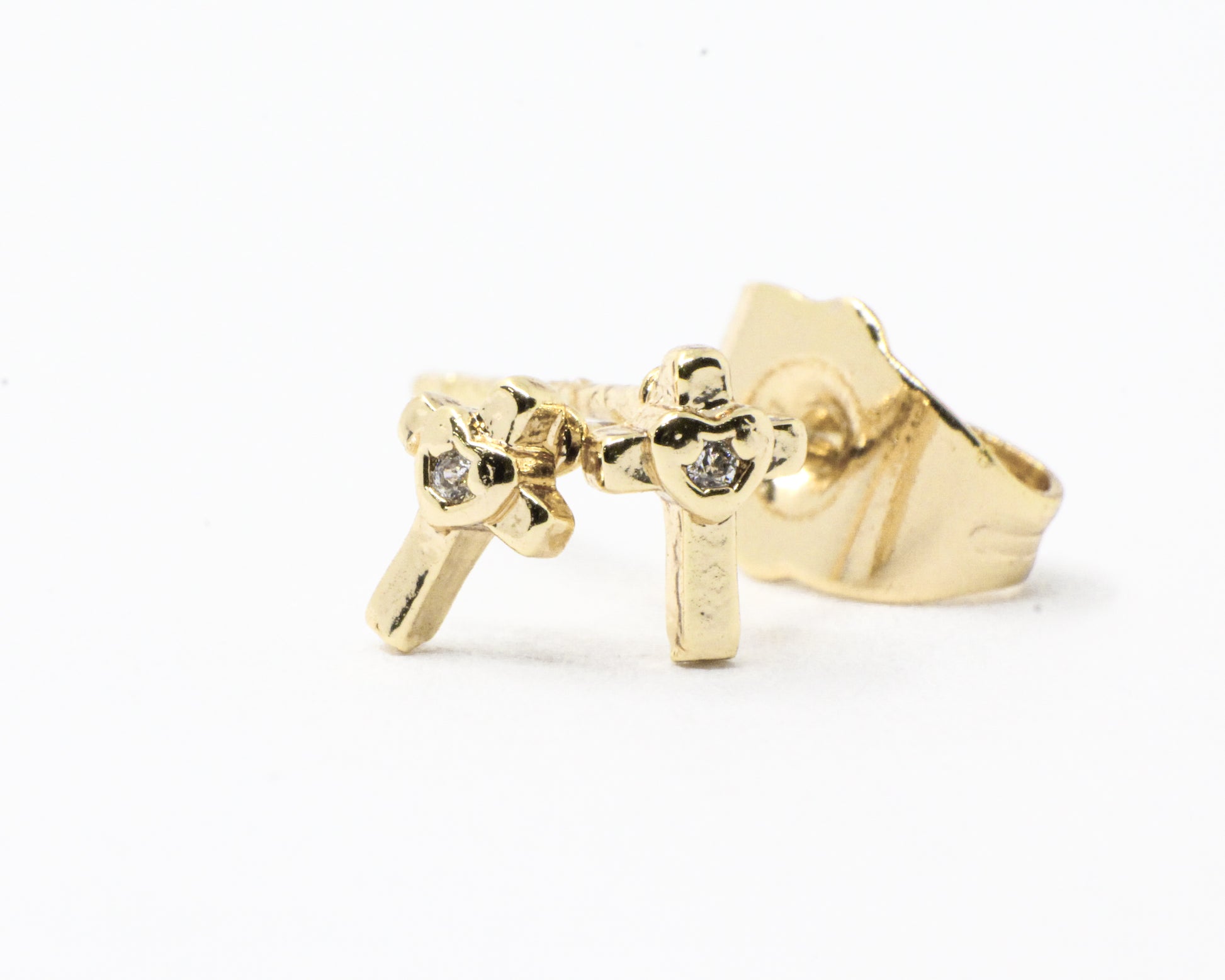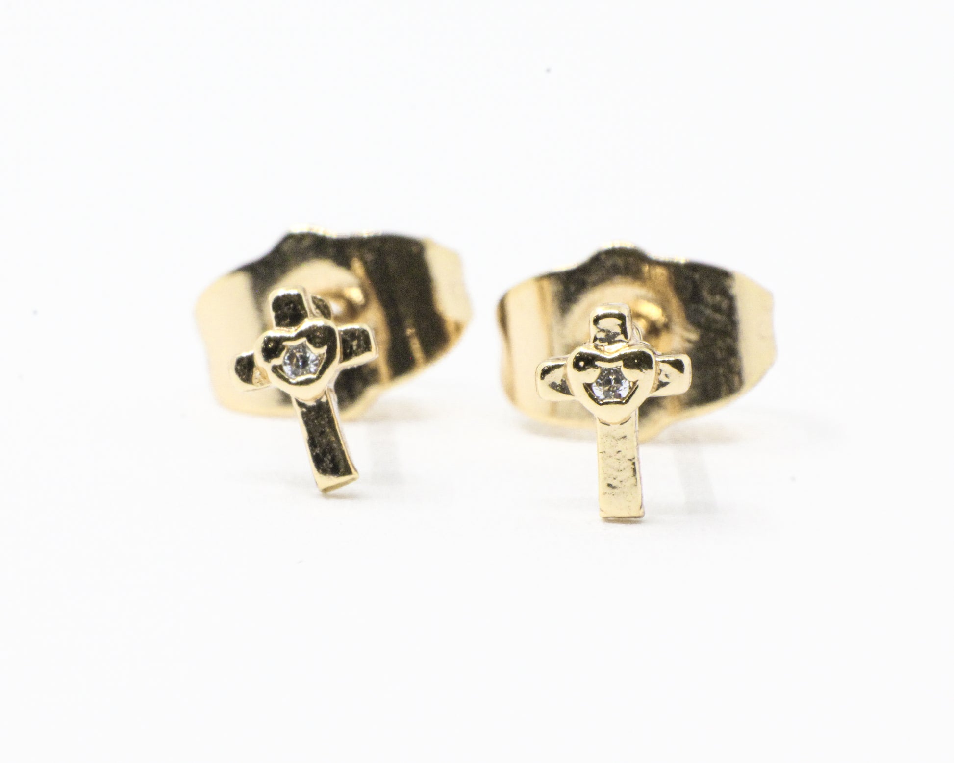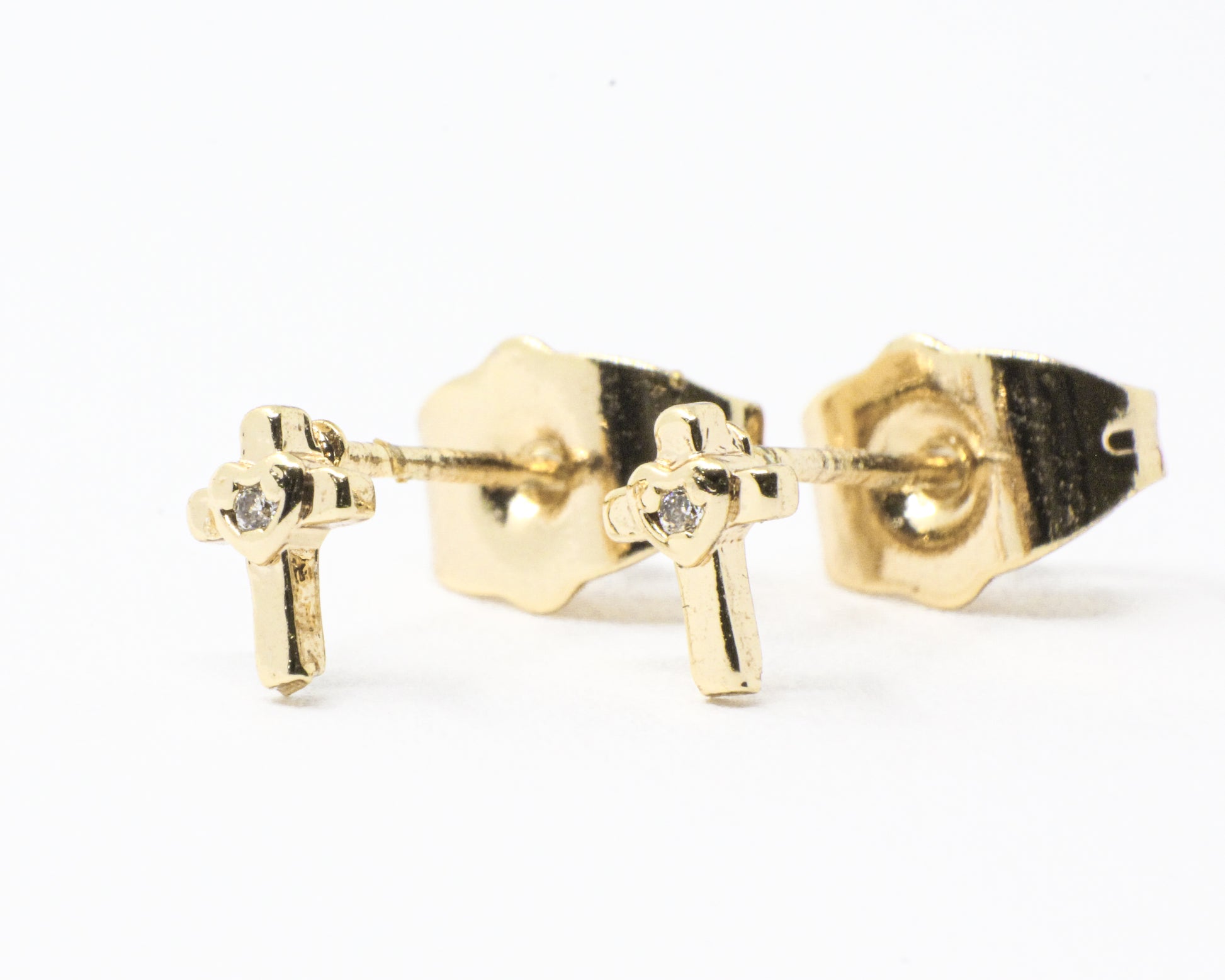 Un par de topos dorados en forma de cruz, con un sutil corazón en el centro adornado con un circón blanco puro, que suaviza la figura mientras añade un toque de delicadeza. Luce una joya sofisticada y de moda con nuestros topos, que combinan elegancia y belleza en una sola pieza.