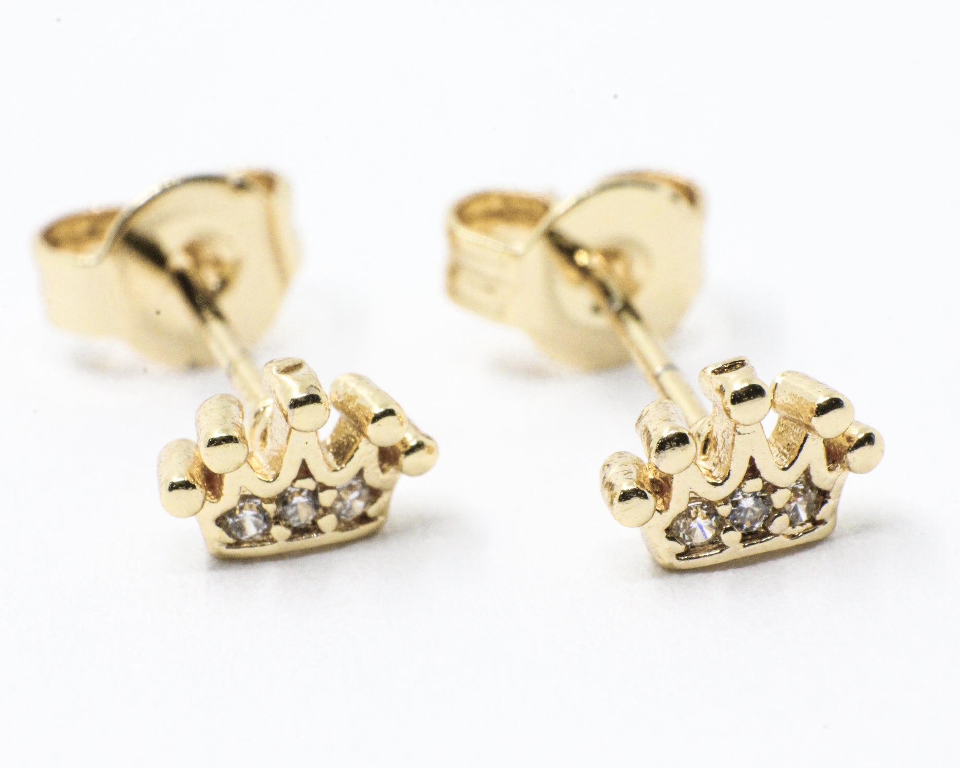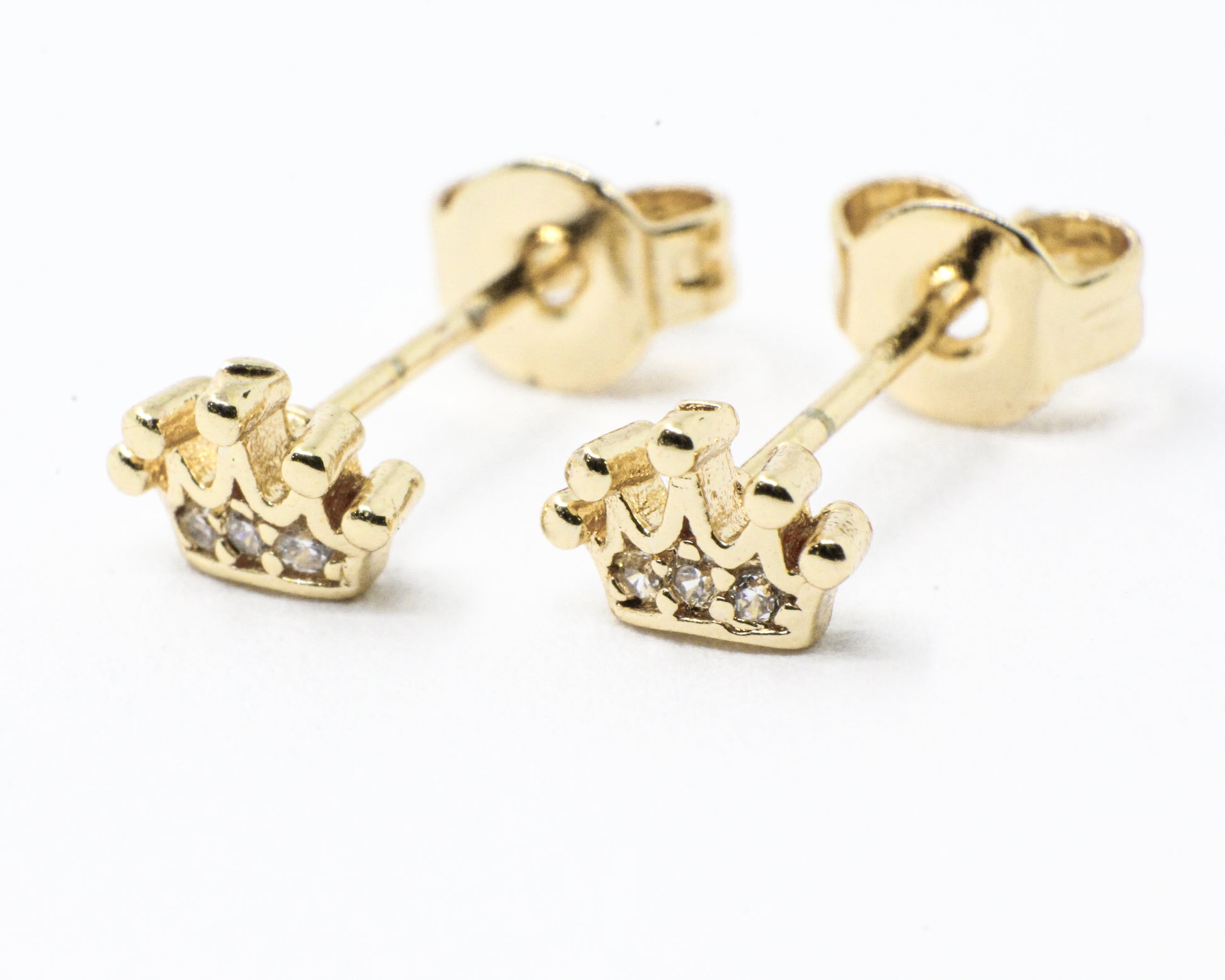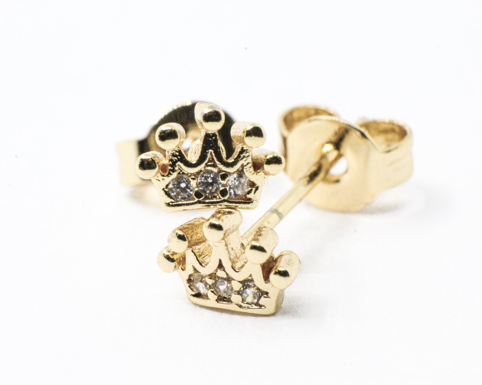 Un par de topos dorados en forma de corona, realzados con circones blancos en el centro, que aportan un toque de realeza y sofisticación. ¡Haz una declaración de estilo con los topos Corona Dorado!