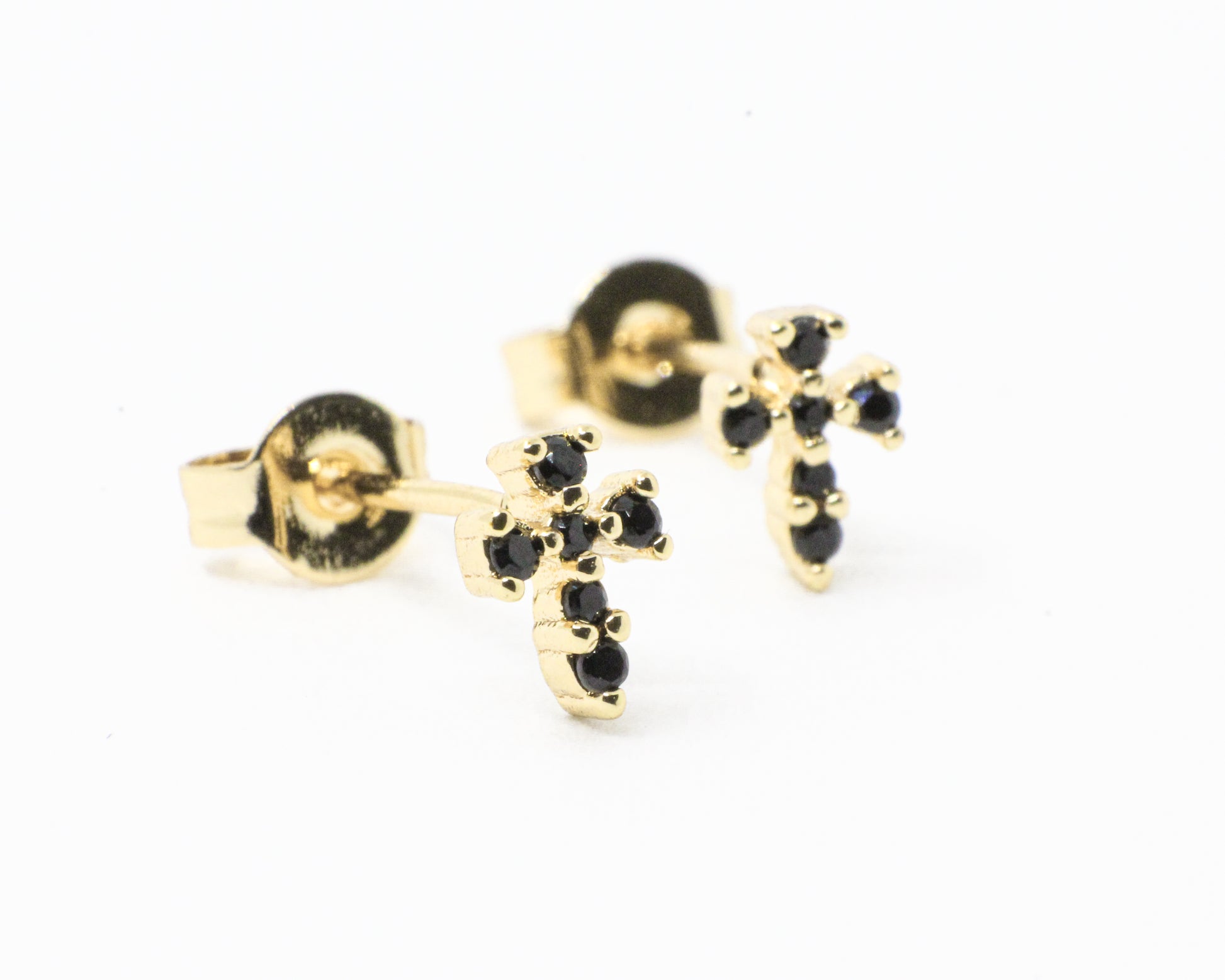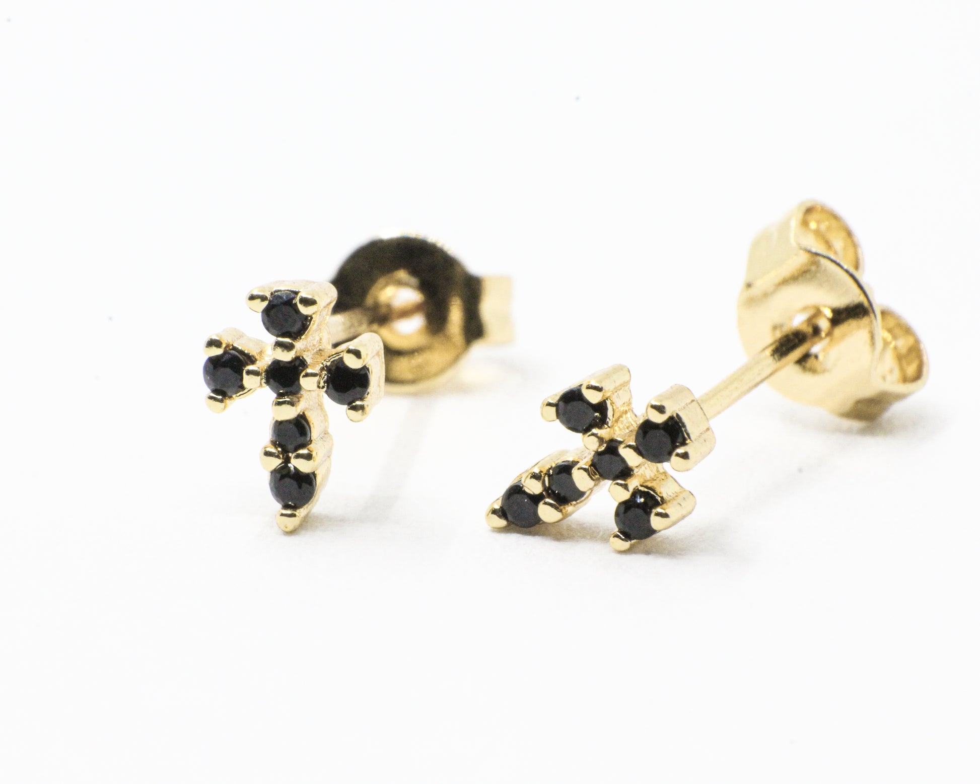 Un par de topos dorados en forma de cruz, engastados con circones negros que se realzan con el brillo cálido del dorado, creando un contraste sofisticado y elegante. Un accesorio que te hará sentir conectada con tu fe y, al mismo tiempo, lucir hermosa.