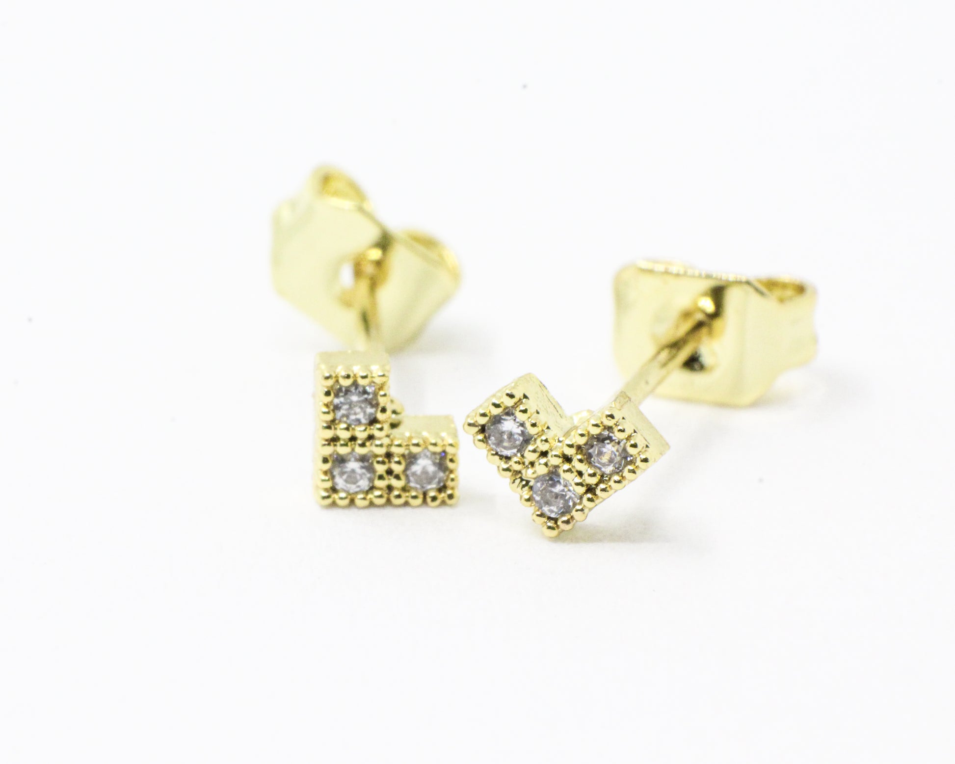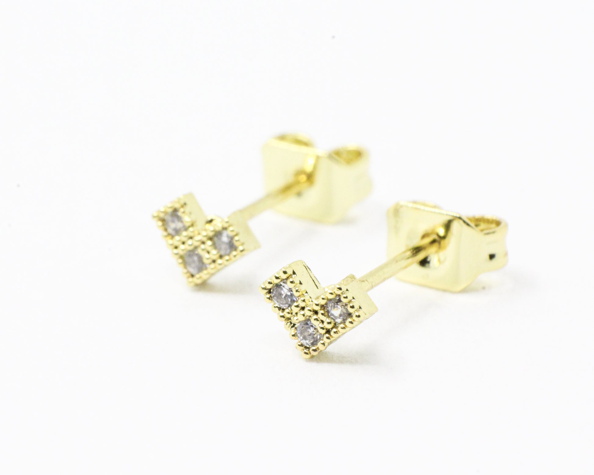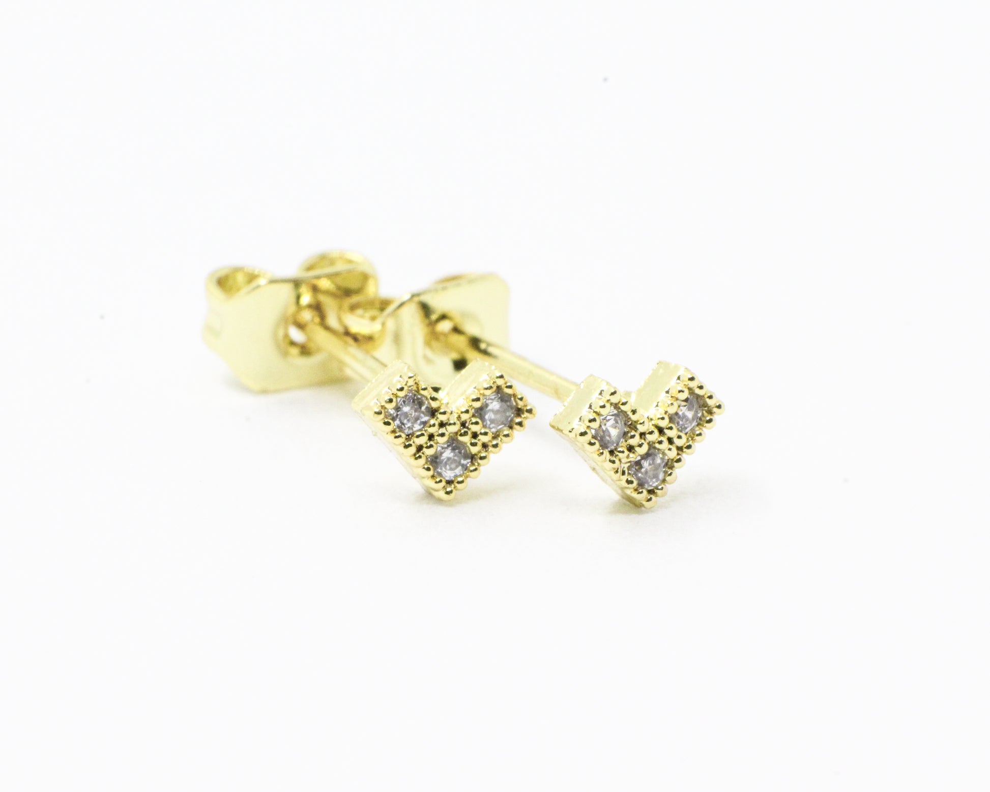 Un par de topos dorados en forma de corazón, inspirados en la geometría del amor, con un diseño moderno y sofisticado. Resalta tu estilo con este elegante accesorio que representa amor, belleza y significado en cada piedra.