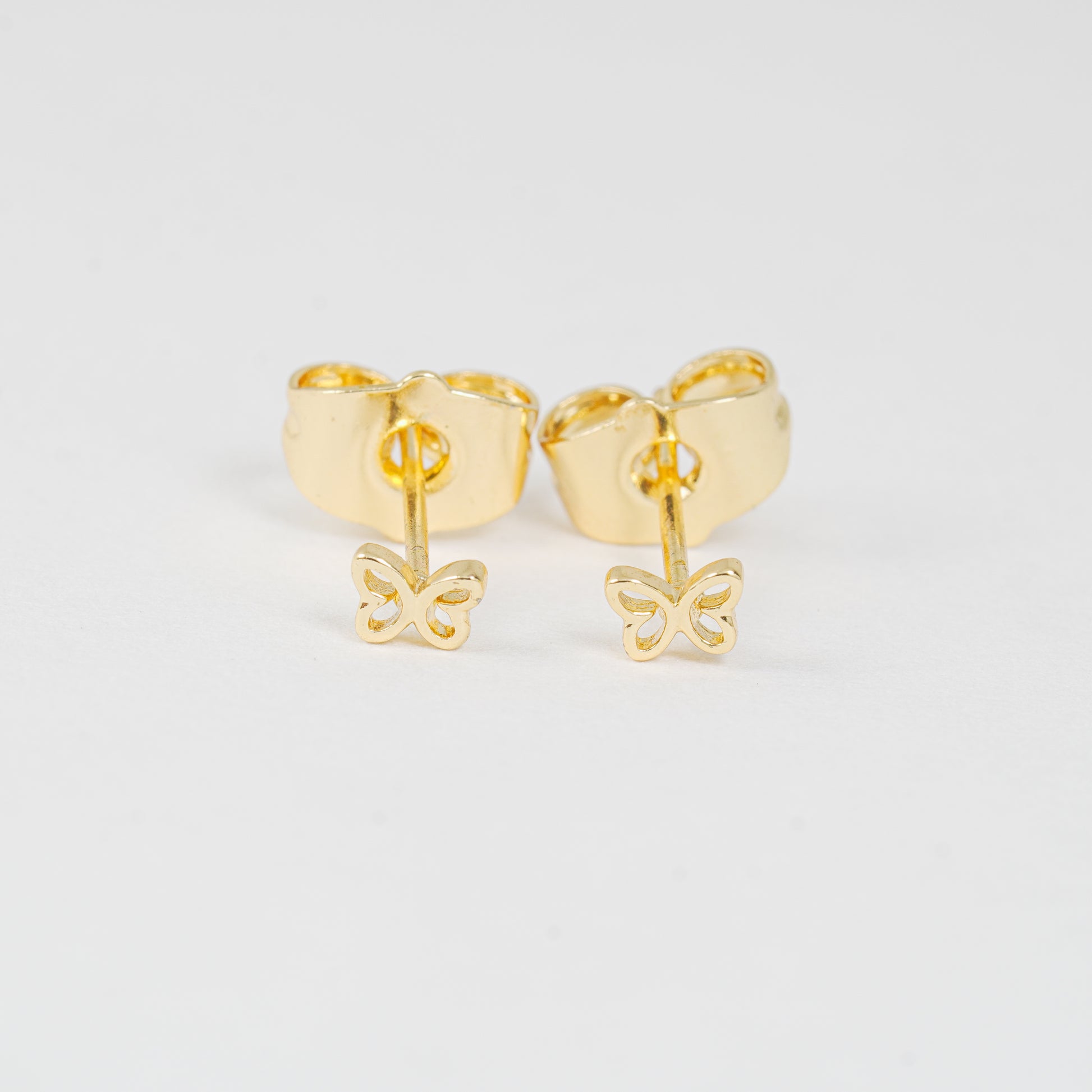 Un par de topos dorados con silueta de mariposa, un diseño sutil que evoca delicadeza y elegancia. Estas piezas no solo son accesorios impresionantes, sino también una muestra de buen gusto y estilo.