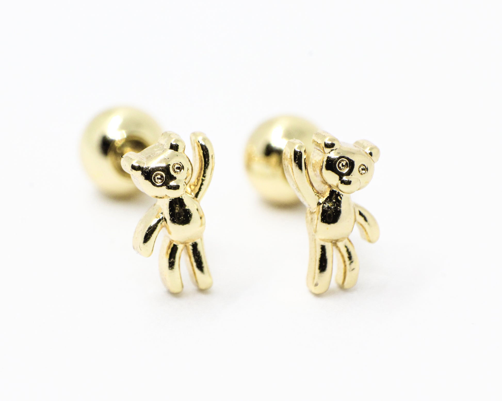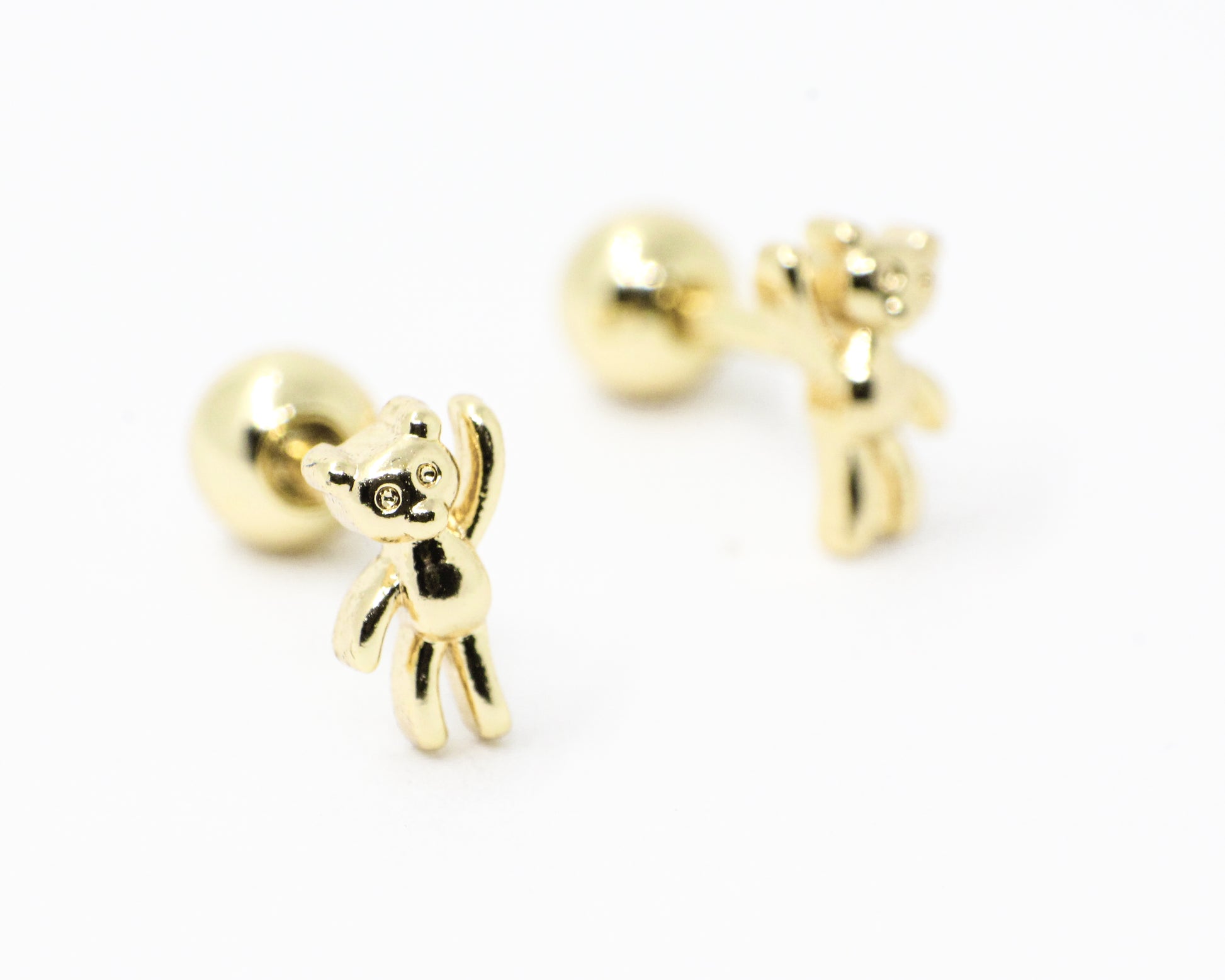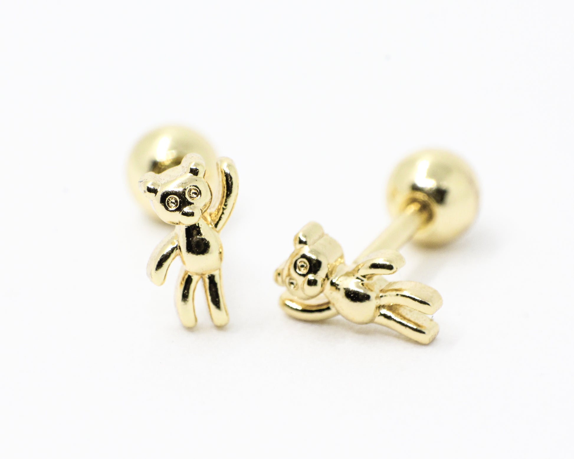 Un par de topos dorados con tuerca de seguridad, en forma de encantador oso tipo globo, cuyo trazado suave y sereno aporta ternura al diseño. Con su brillo y diseño cautivador, esta pieza se destacará en cualquier ocasión.