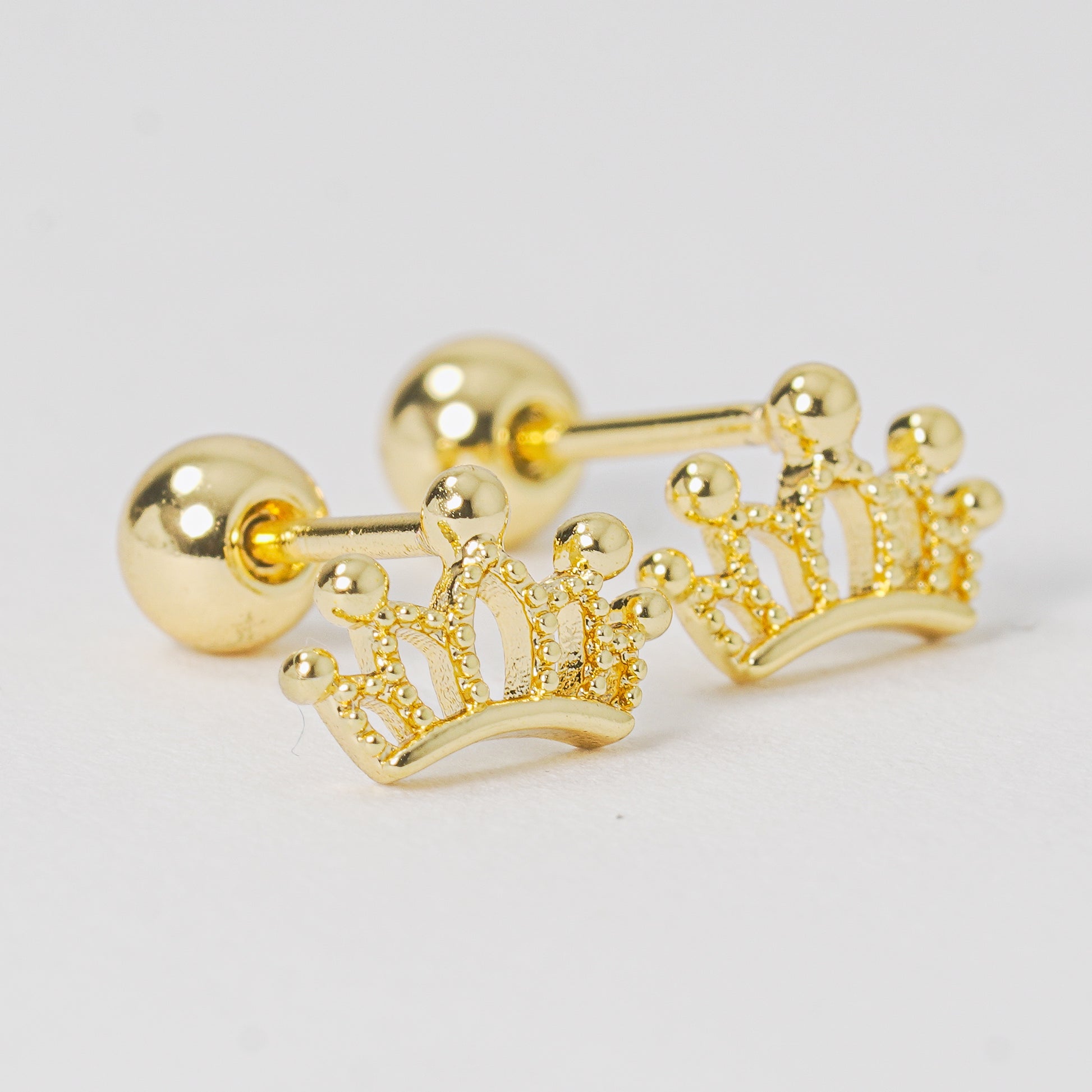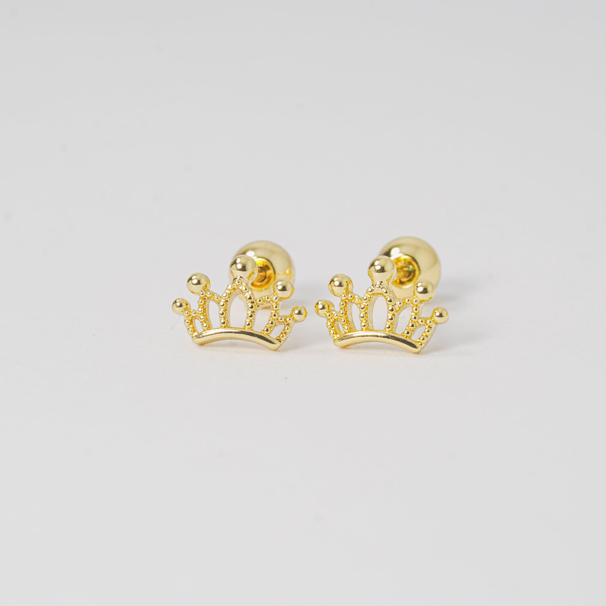 Topos dorados en forma de corona delineada, diseñados con un trazo delicado que resalta su elegancia sin perder ligereza. Los circones blancos añaden destellos sutiles que iluminan cada movimiento.